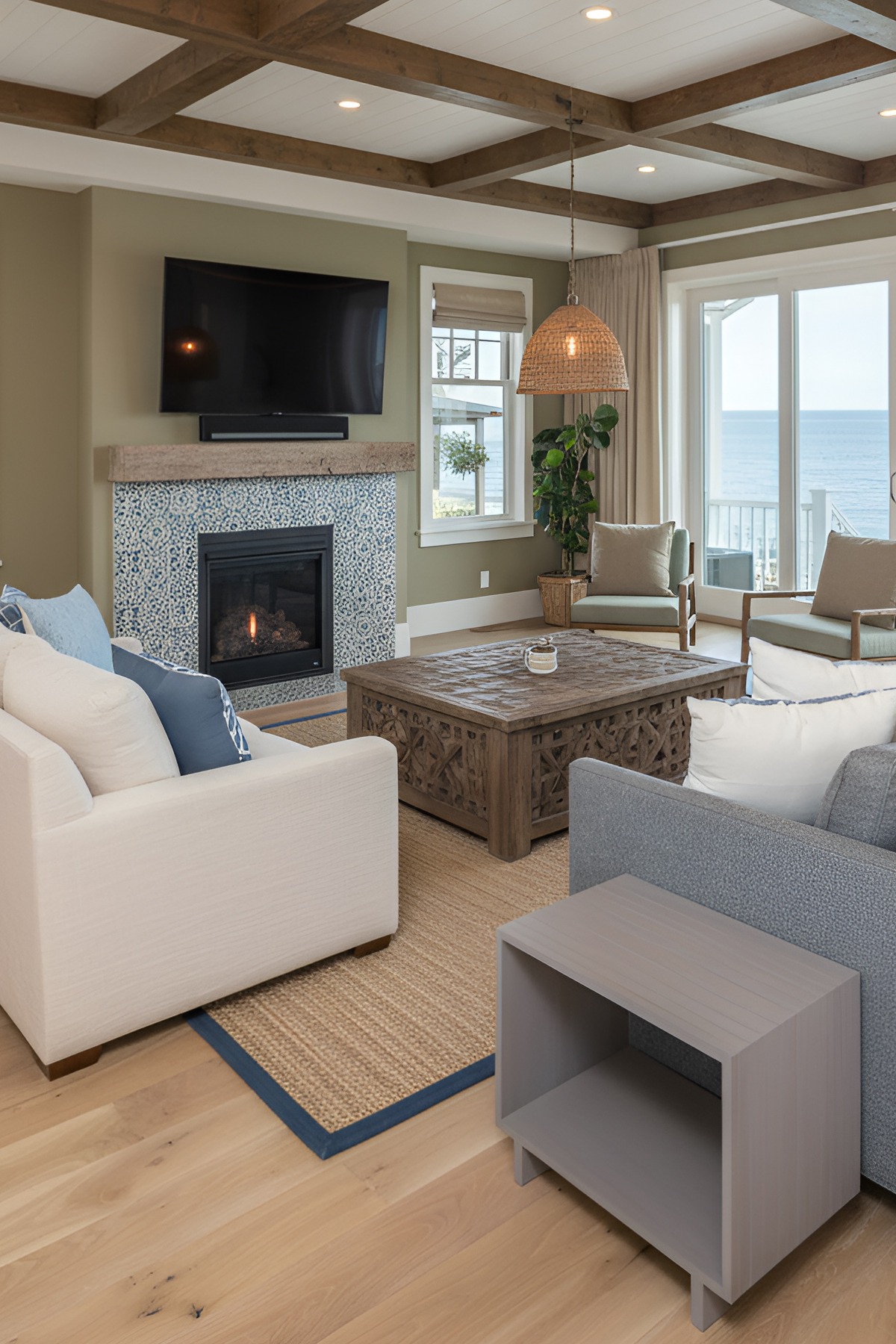 This is where many rooms go off track. A beach house living room does not need to shout “beach.” It does not need anchors, rope signs, or piles of seashell prints. Instead, let the coastal feeling show up in softer ways.