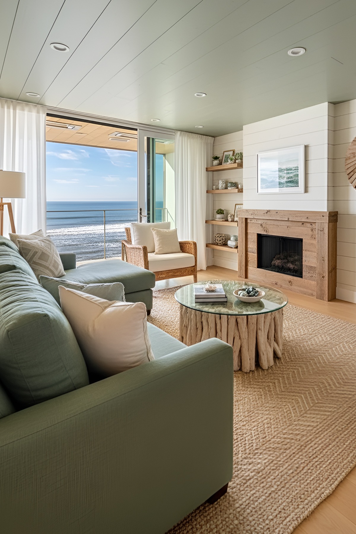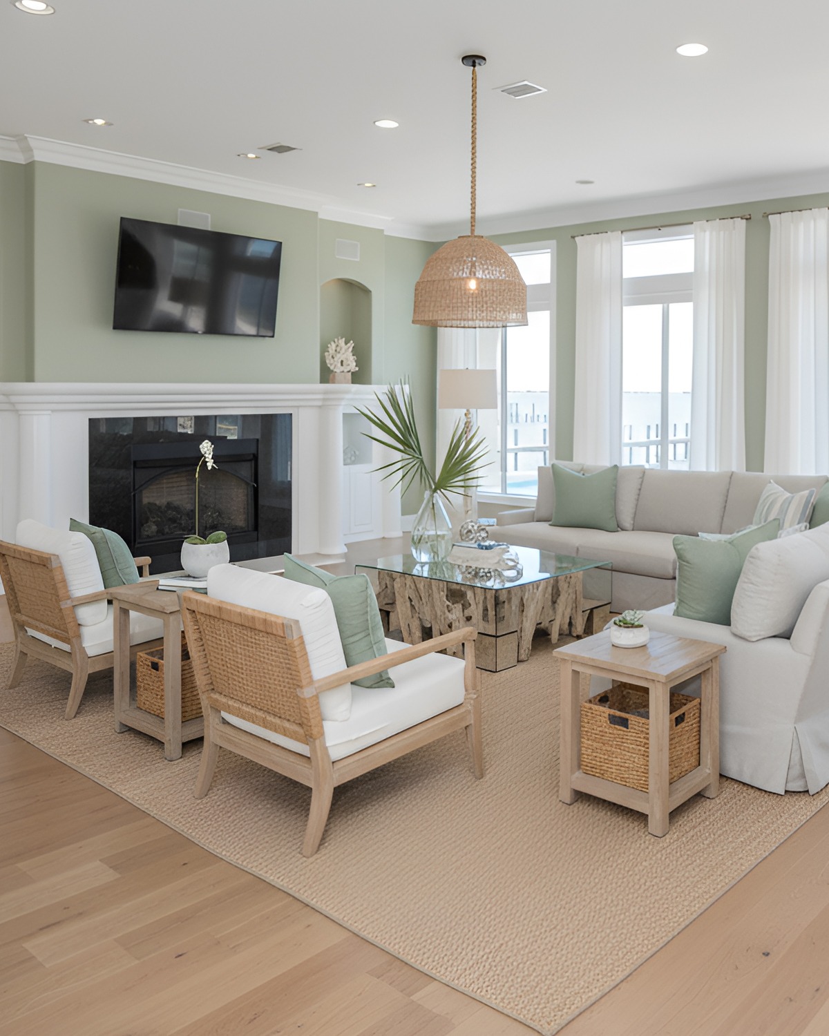 A rug can tie the whole room together. In a sage green beach house living room, a rug should feel natural, soft, and relaxed. Jute and seagrass rugs are classic choices because they add texture right away. They also pair beautifully with sage green.