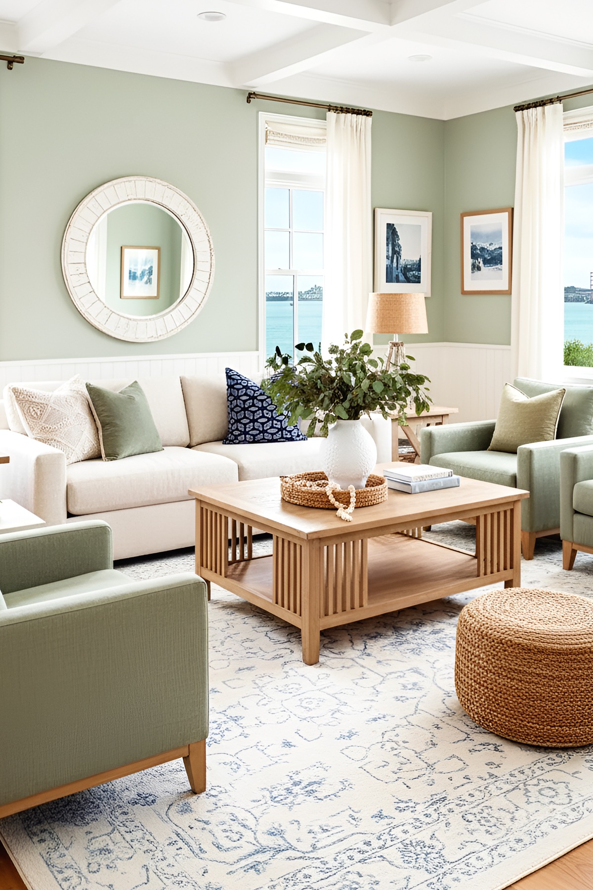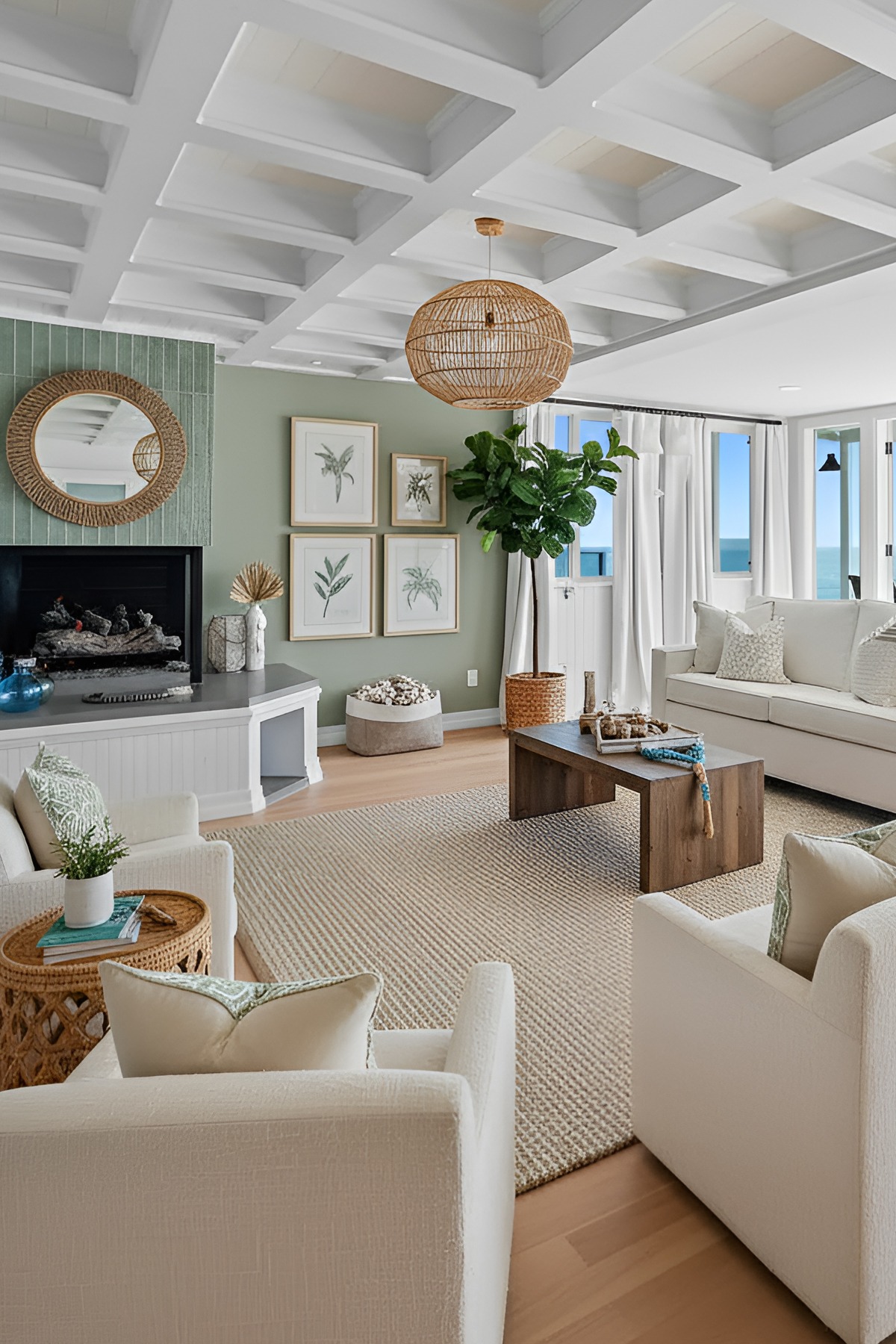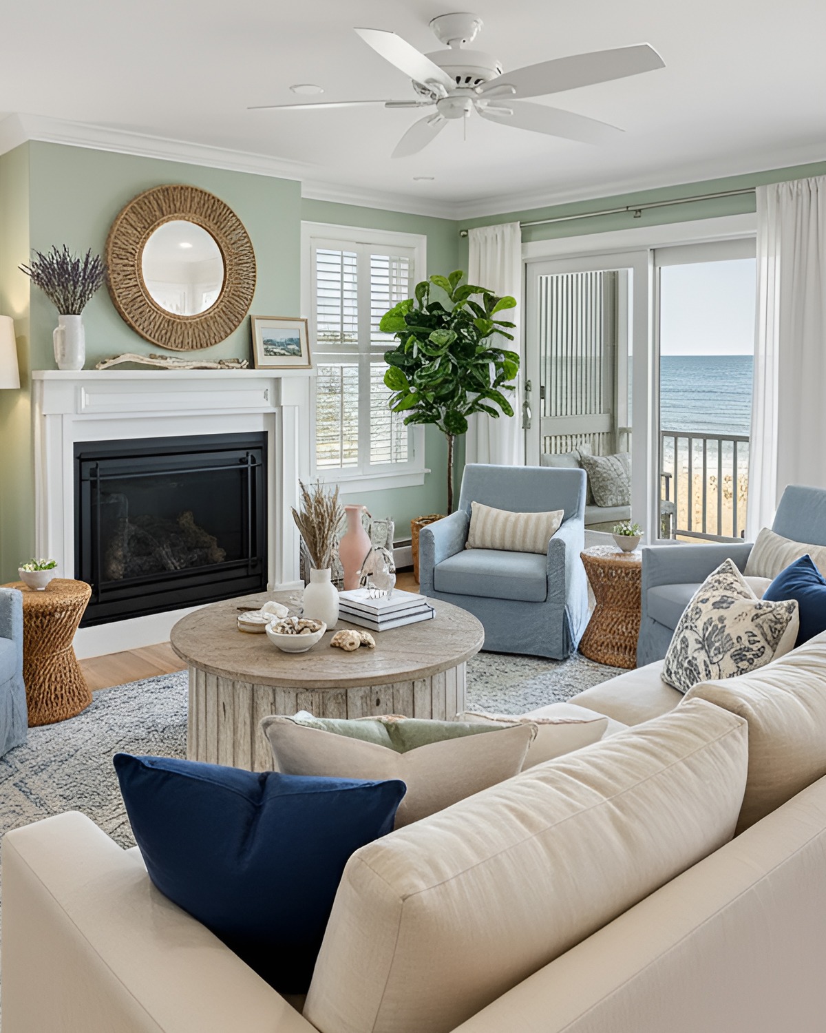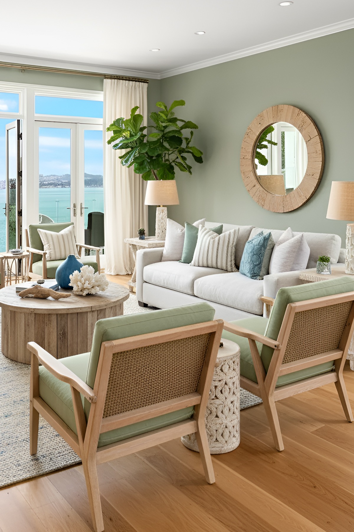 A strong beach house palette often starts with sage green and creamy white. Then it adds warm beige, soft tan, pale wood, and touches of muted blue. This mix keeps the room from feeling flat. It also keeps the green from feeling too cold.