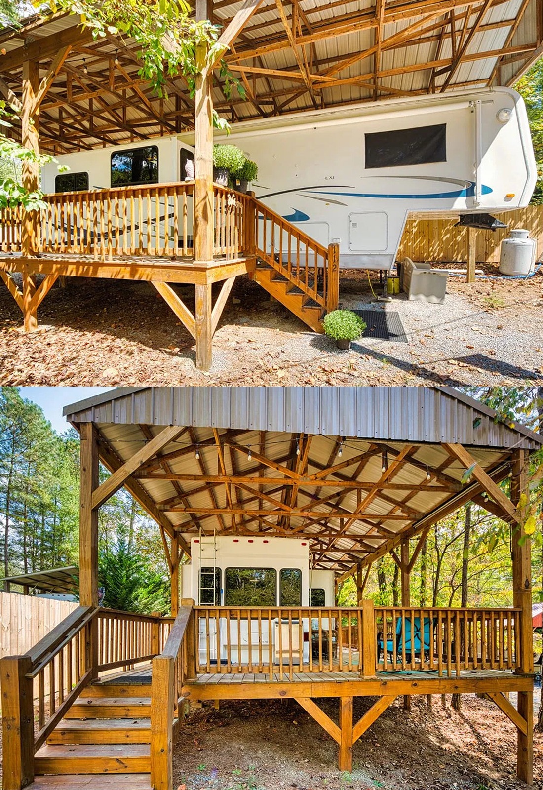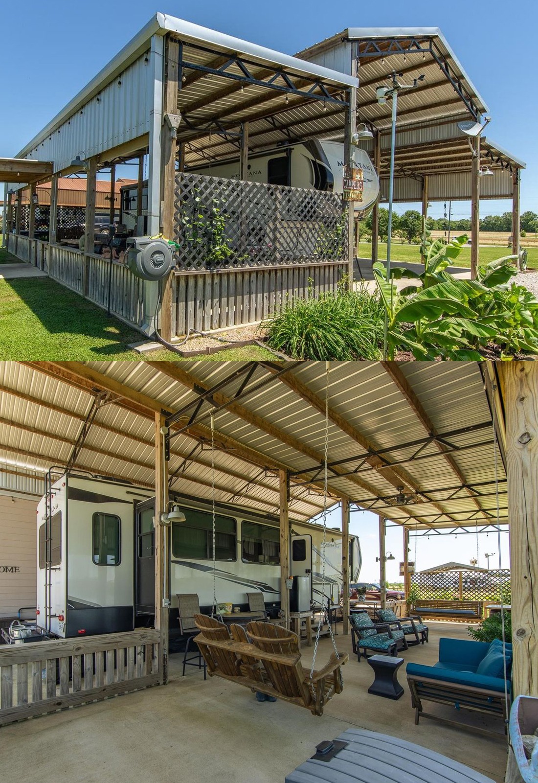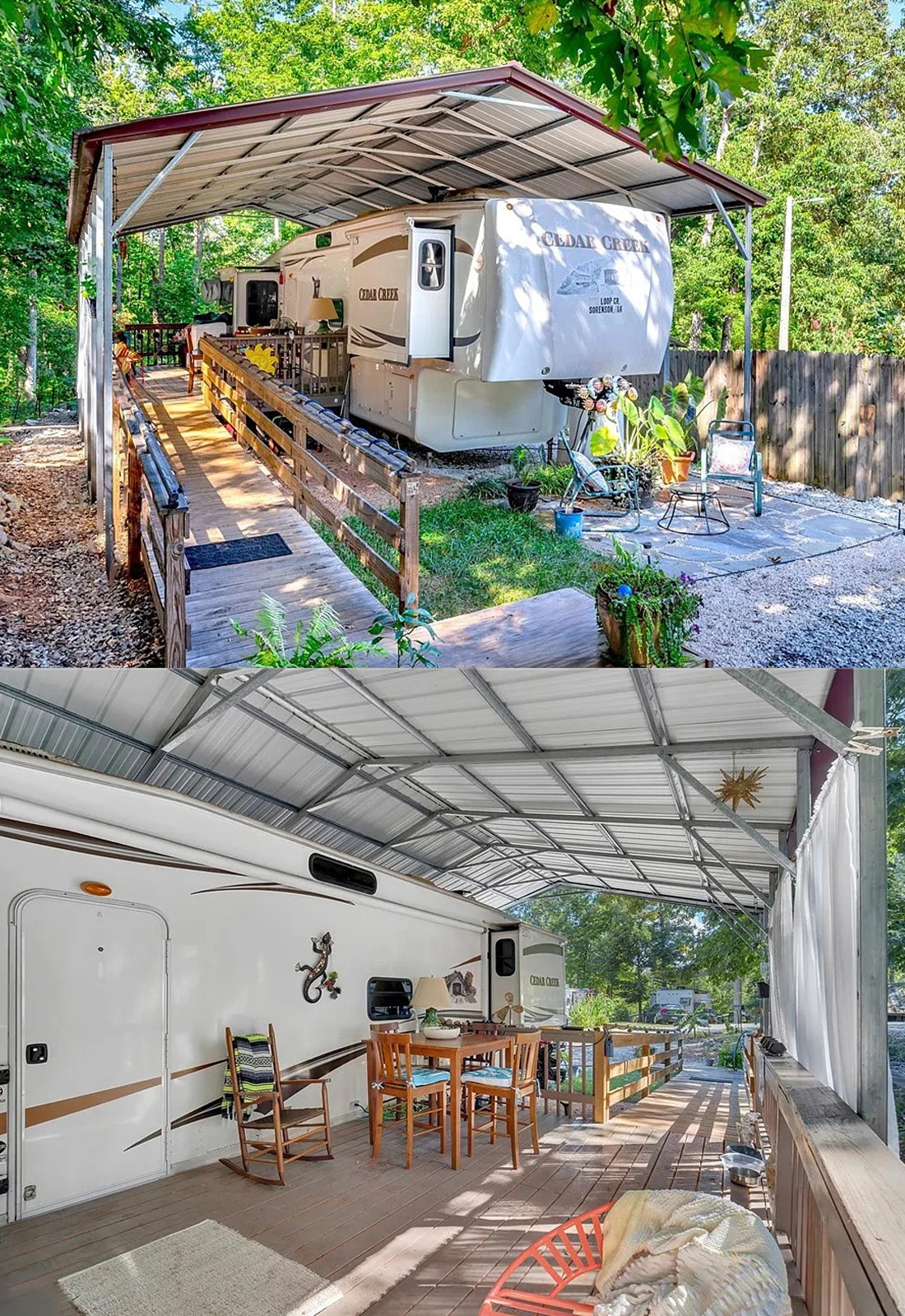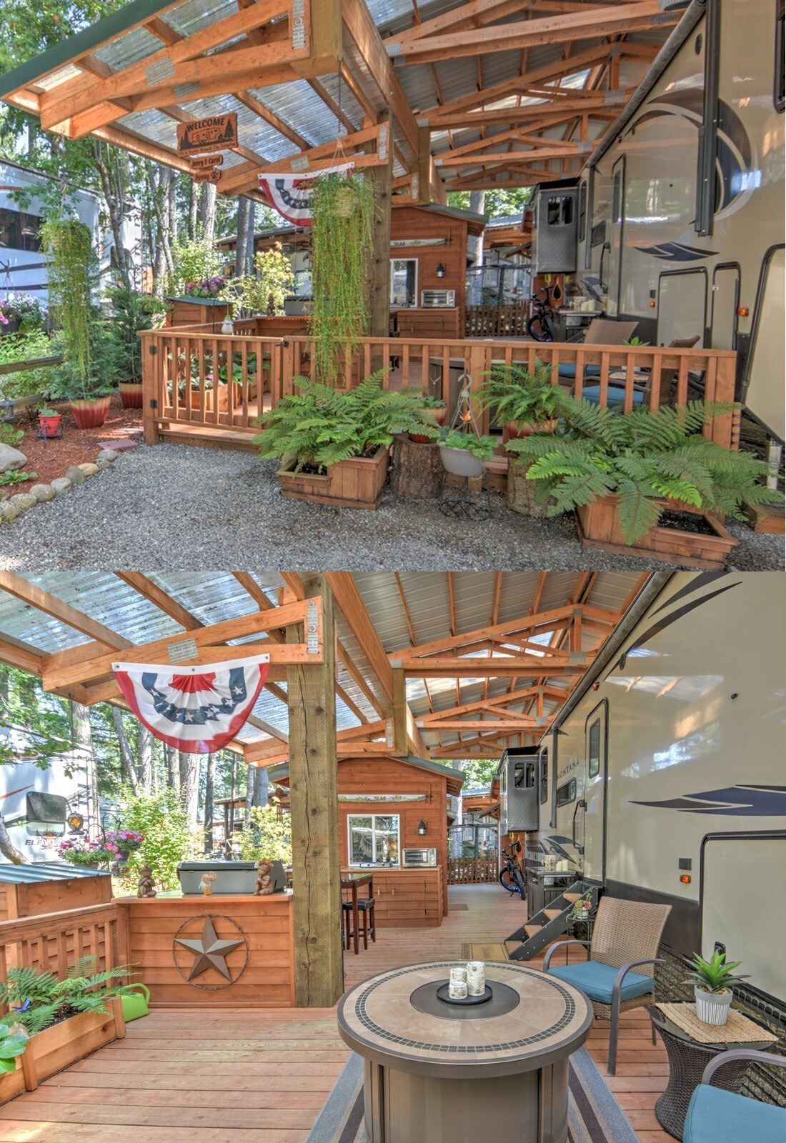 This setup feels the most like a tiny backyard retreat. The ferns, planters, and hanging baskets make the whole deck feel lush and personal. Instead of looking like a plain shelter for an RV, it feels like a garden room with a fifth wheel tucked inside. That is what makes it memorable.