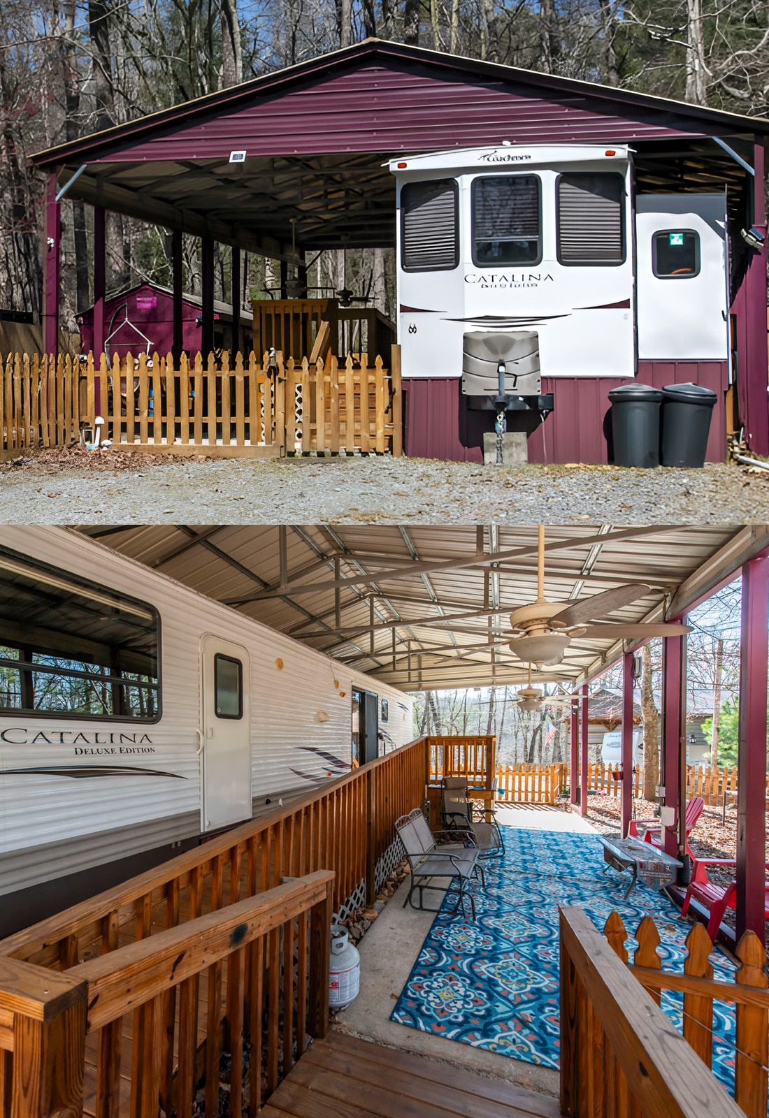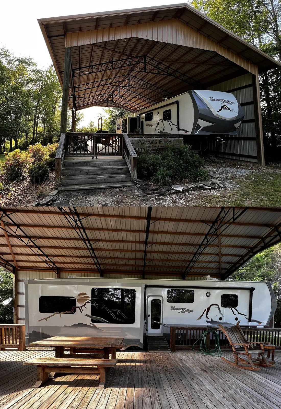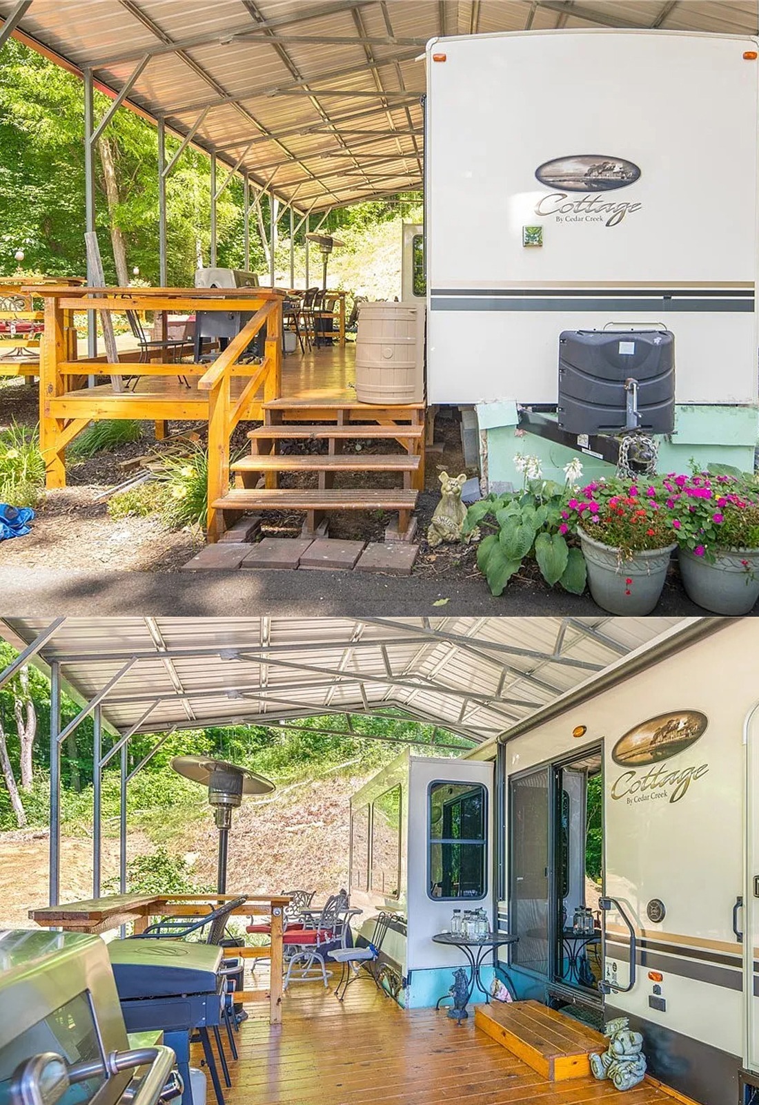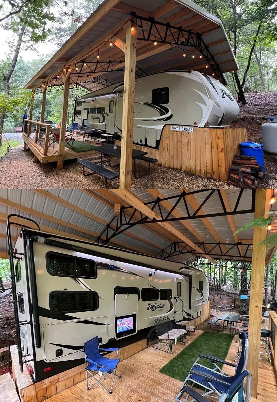 This setup feels the most like a tiny backyard retreat. The ferns, planters, and hanging baskets make the whole deck feel lush and personal. Instead of looking like a plain shelter for an RV, it feels like a garden room with a fifth wheel tucked inside. That is what makes it memorable.