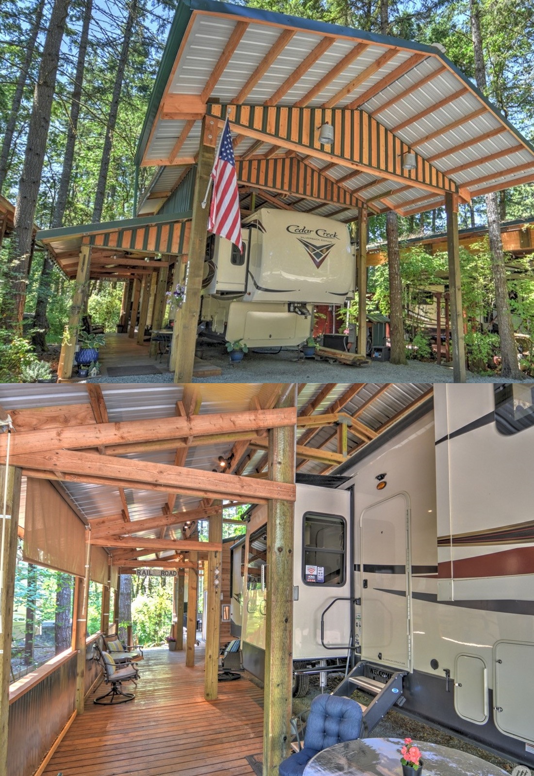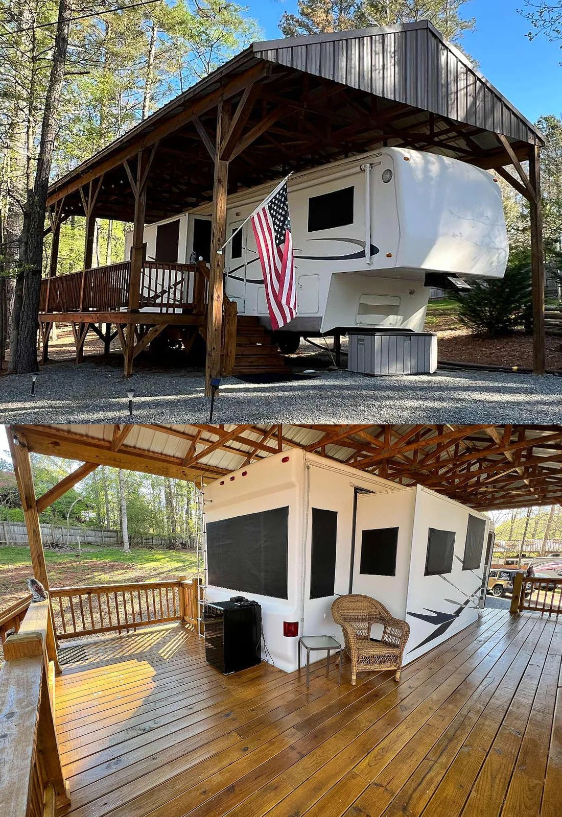This setup feels a little more refined. The darker wood stain gives the structure a richer look, and the flag adds a personal touch that makes the space feel rooted and proud. From the outside, the tall shelter gives the RV a clean, protected frame. It looks neat, organized, and permanent.
