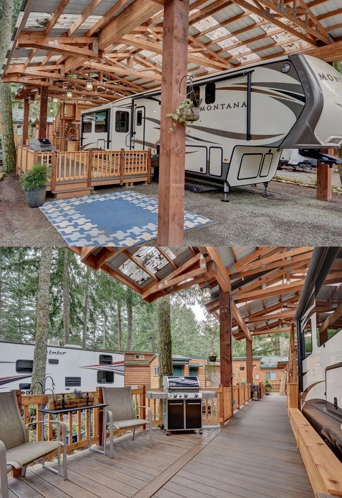 This design leans into a cabin feel. The large gable roof is tall enough to make the site feel airy, yet the wood deck below keeps everything grounded and cozy. From the front, the steps and raised platform create a true porch look. That alone makes the RV feel more like a tiny lodge than a temporary setup.