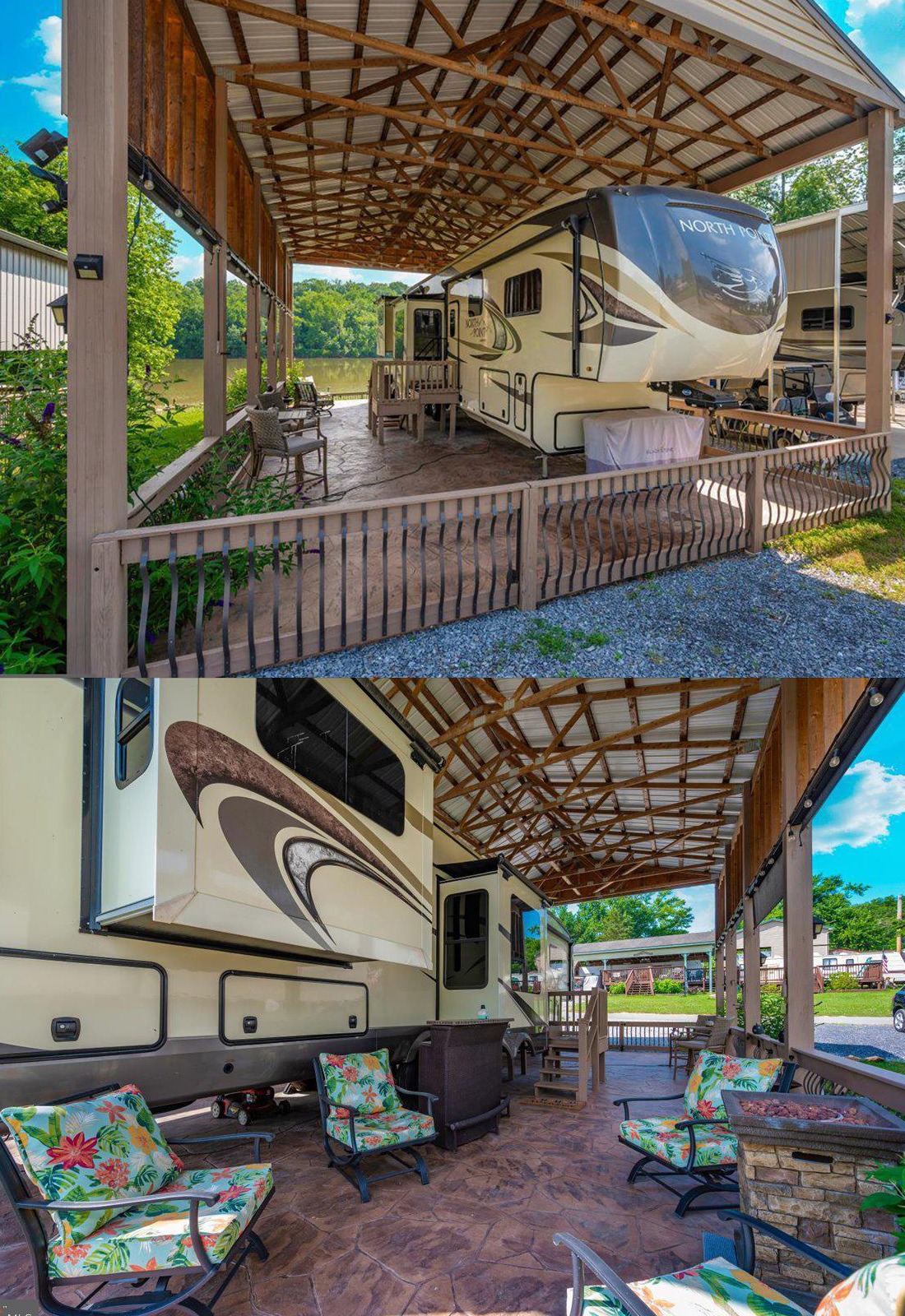 What makes this setup stand out is how balanced it feels. The stamped concrete floor is easy to clean and strong enough for outdoor furniture. Then the low railing creates a gentle boundary without blocking the view. Because the site sits near the water, the open side keeps the setting front and center. This is a great example of how a covered deck can protect the RV while also giving you a real outdoor room.