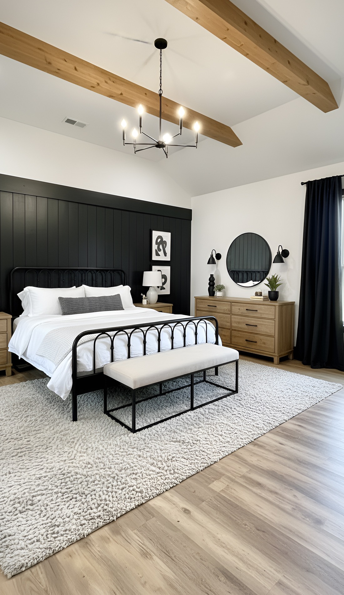 For a crisp and modern barndominium bedroom, black and white with natural wood is a strong design move. This look feels bold, clean, and easy to style.