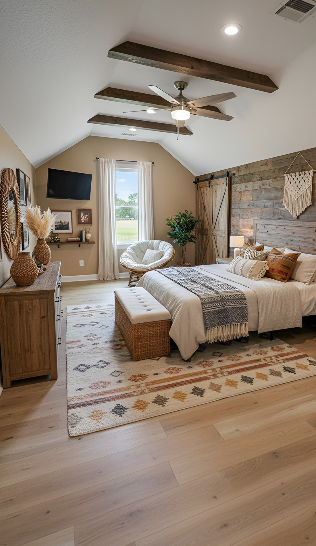If you want your barndominium bedroom to feel relaxed, creative, and full of texture, a boho rustic mix can be a lovely fit. It blends earthy charm with softness and personality.