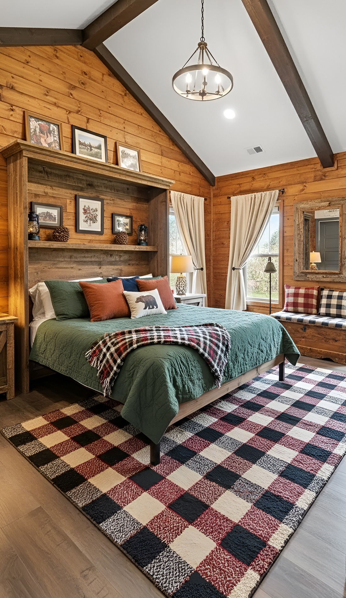 If you want your barndominium bedroom to feel like a tucked-away retreat, lean into cabin-inspired decor. This look wraps the room in warmth and makes it feel deeply restful.