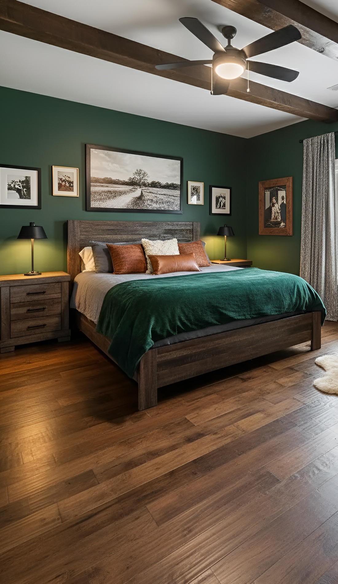 Think deep charcoal, warm brown, forest green, navy, or earthy black. Use these shades on the walls, bedding, or accent furniture. Then balance them with rustic textures like reclaimed wood, leather, iron, and stone-inspired decor.