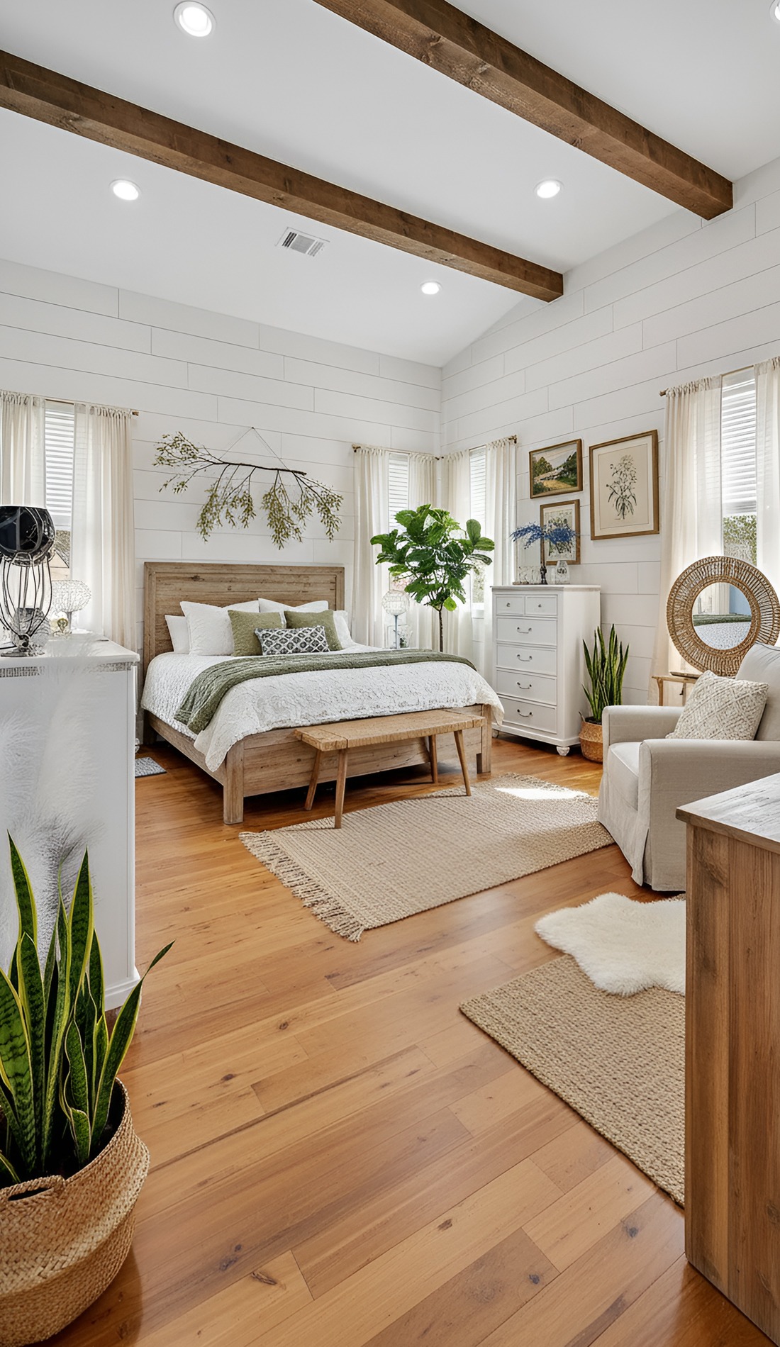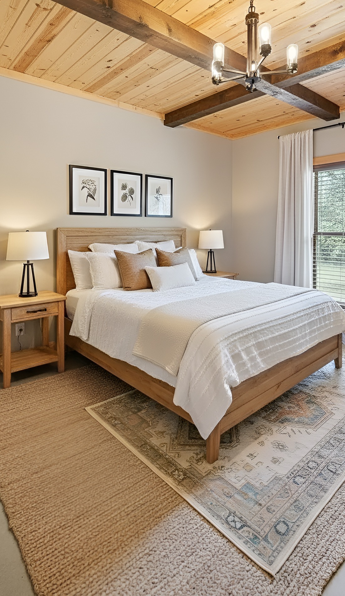 Start with the natural wood tones in the room. That could be ceiling beams, plank walls, hardwood floors, or a wood bed frame. Then bring in white through the bedding, curtains, lampshades, and area rug. The white lightens the mood, while the wood adds depth and warmth.