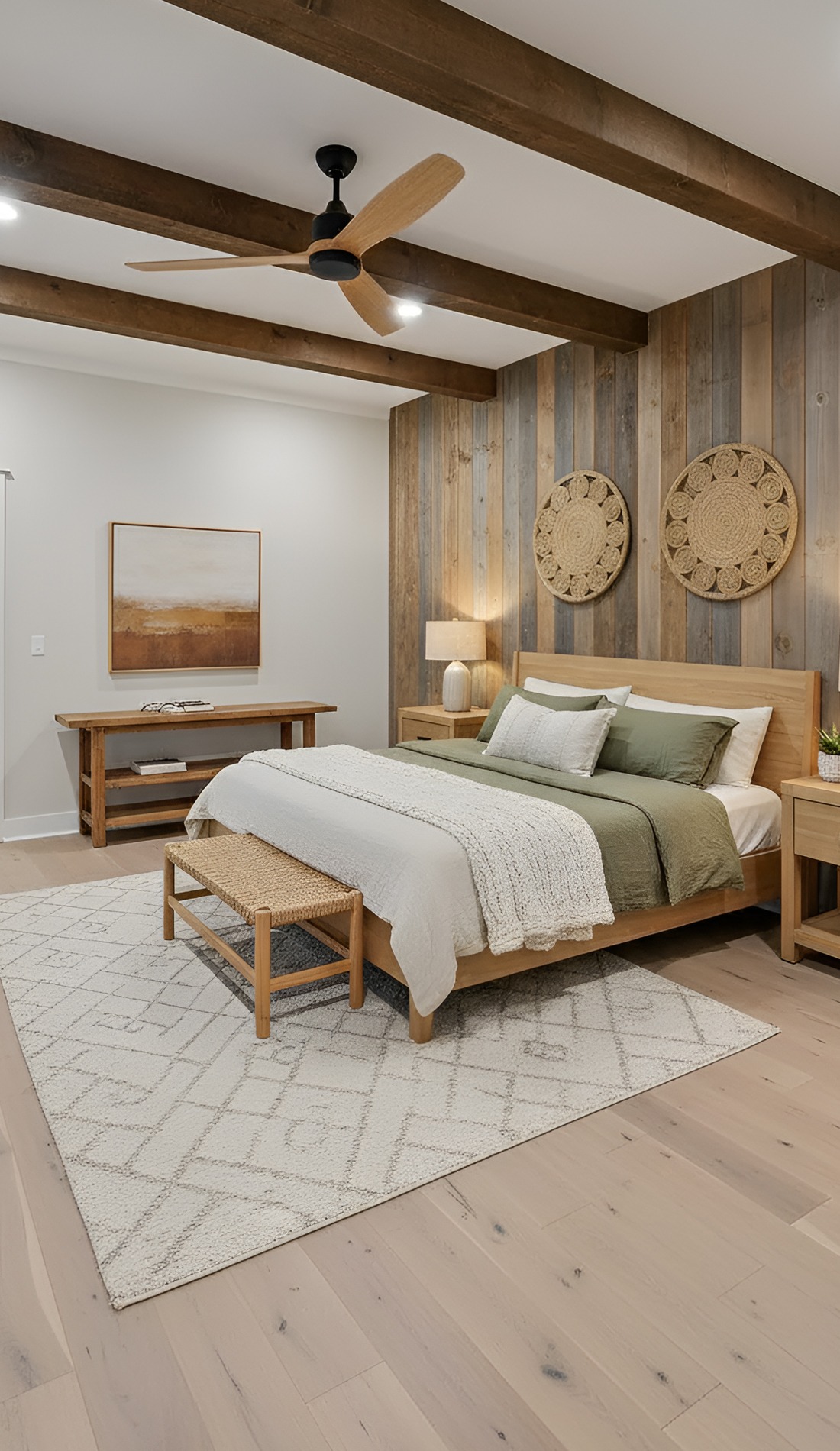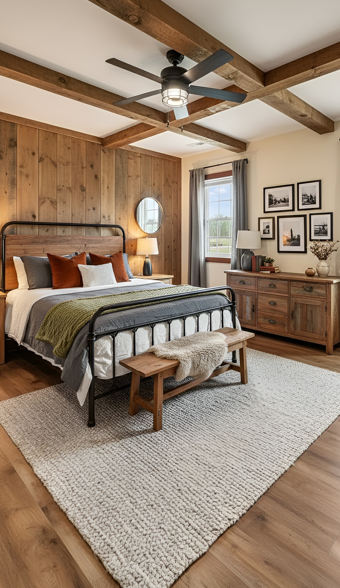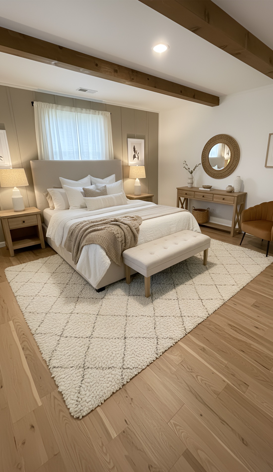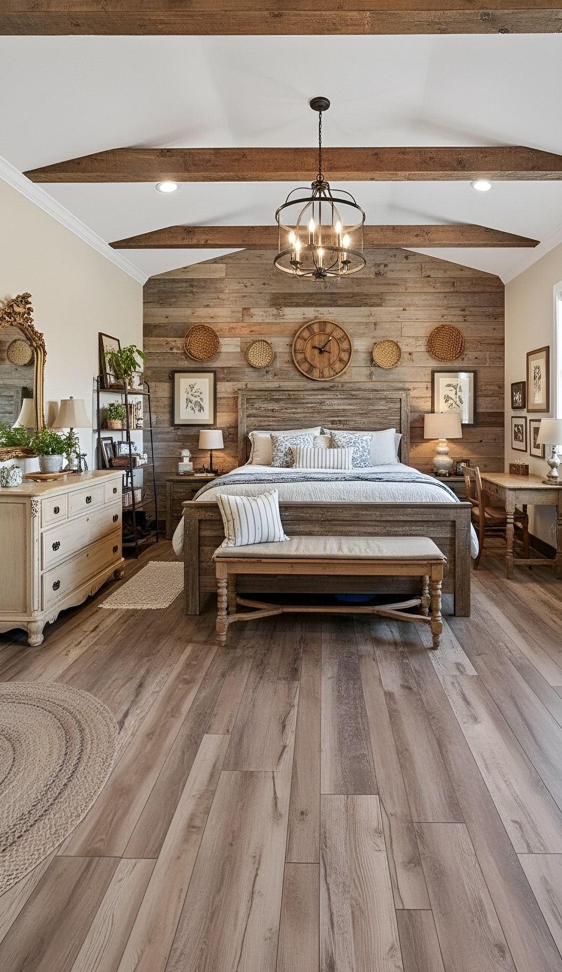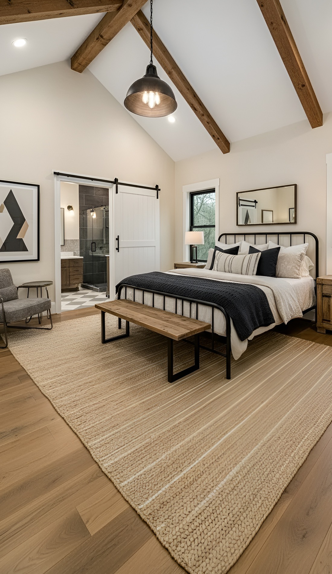 Start with larger pieces. An upholstered bed, oversized nightstands, and substantial lamps help the room feel finished. Then mix in rustic materials like wood beams, wide plank floors, or a weathered bench.