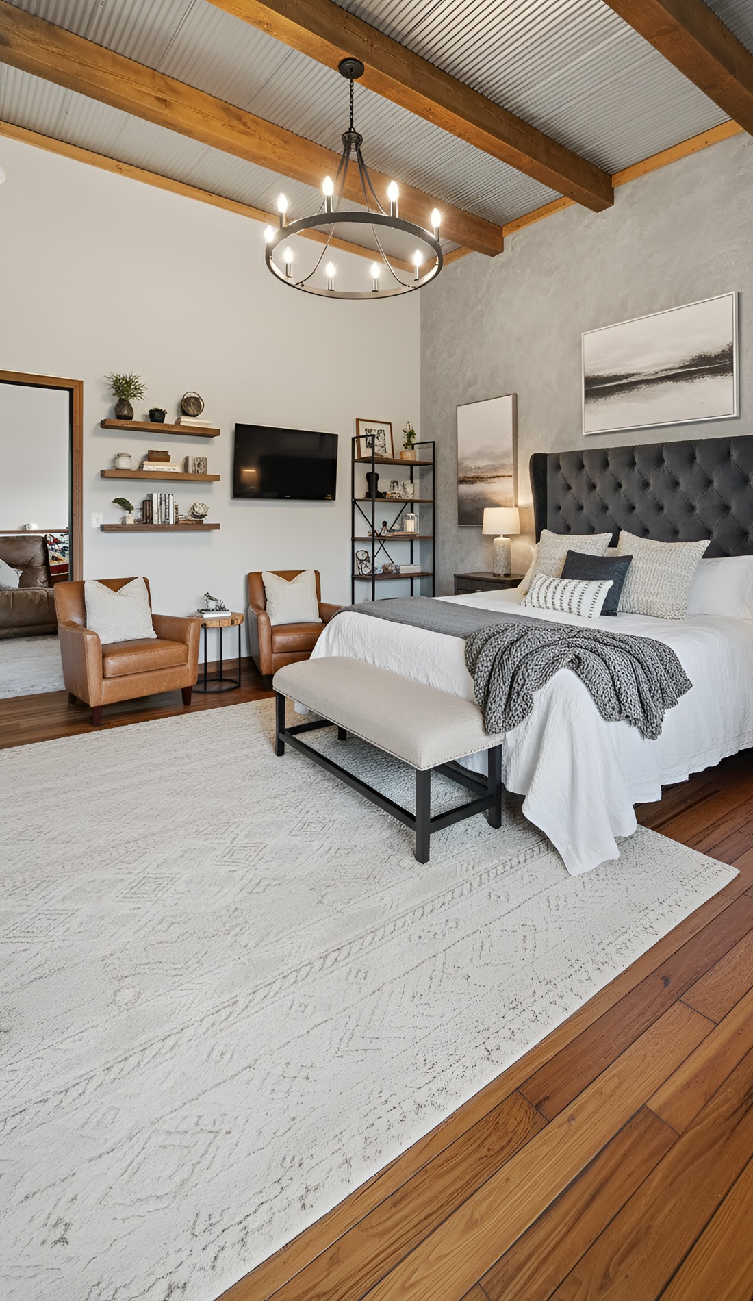 This style is perfect if you want a bedroom that feels quiet and grounded. It brings out the strong, sturdy character of a barndominium while still feeling restful.