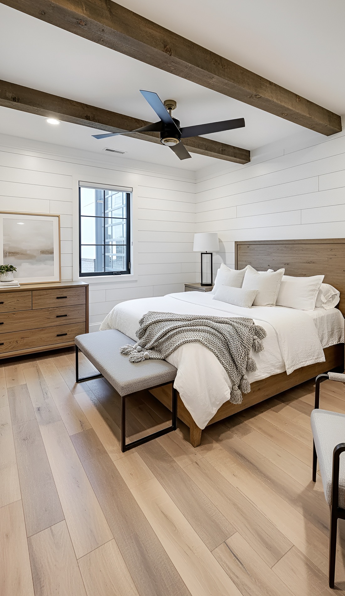 This look usually starts with a simple palette. White, cream, taupe, gray, and soft black all work well. Then add furniture that feels sturdy but not bulky. A shaker-style bed, a wood bench, simple nightstands, and clean-lined table lamps are all strong choices.