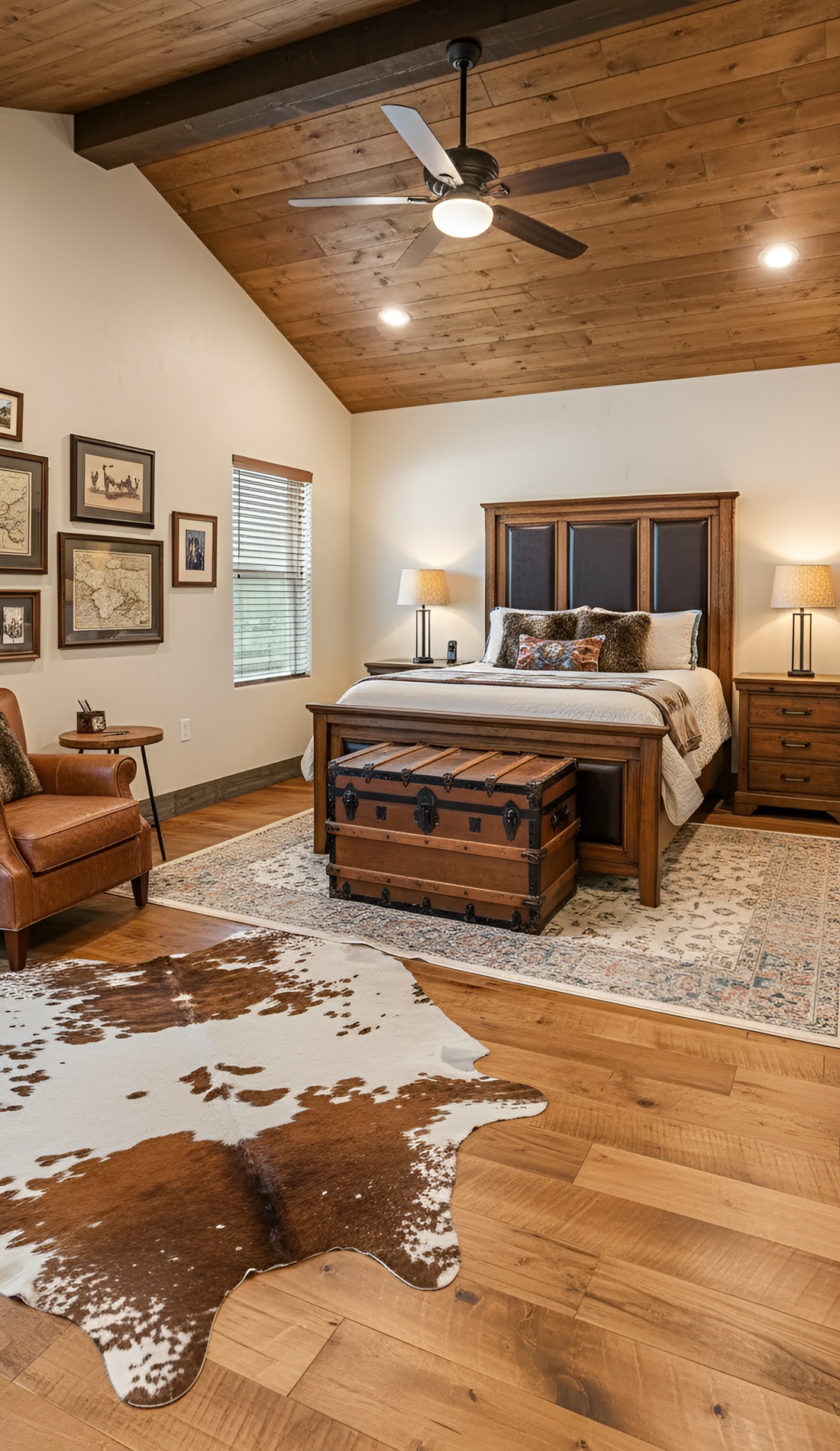 You can add western charm through artwork, a bench at the foot of the bed, or a statement light fixture. A vintage trunk, cowboy-inspired photography, or stitched leather pillows can all bring in personality.