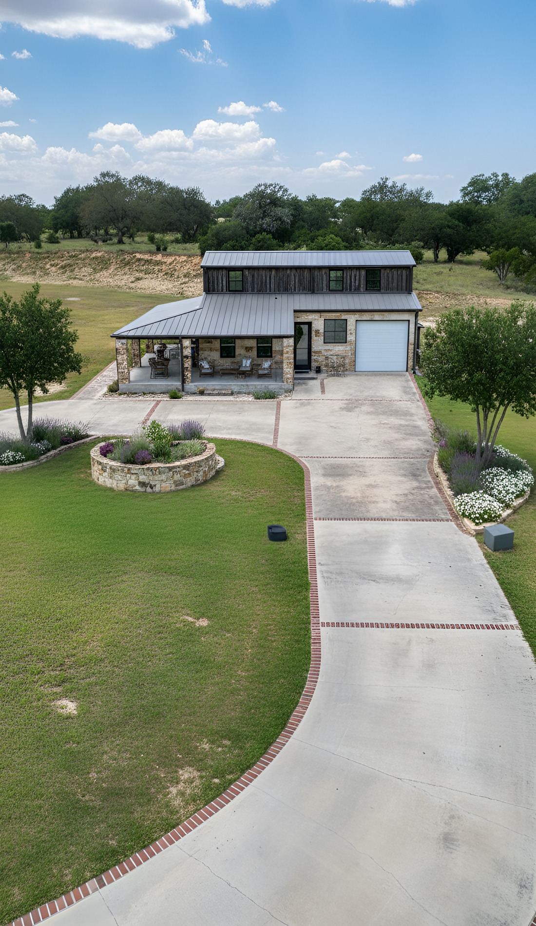 Next, think about your home’s style. A rustic barndominium may look best with gravel, stone borders, and native plants. A modern design may need concrete, clean lines, and simple lighting. A farmhouse-inspired barndominium may shine with a circular drive, soft landscaping, or a grass-strip center.
