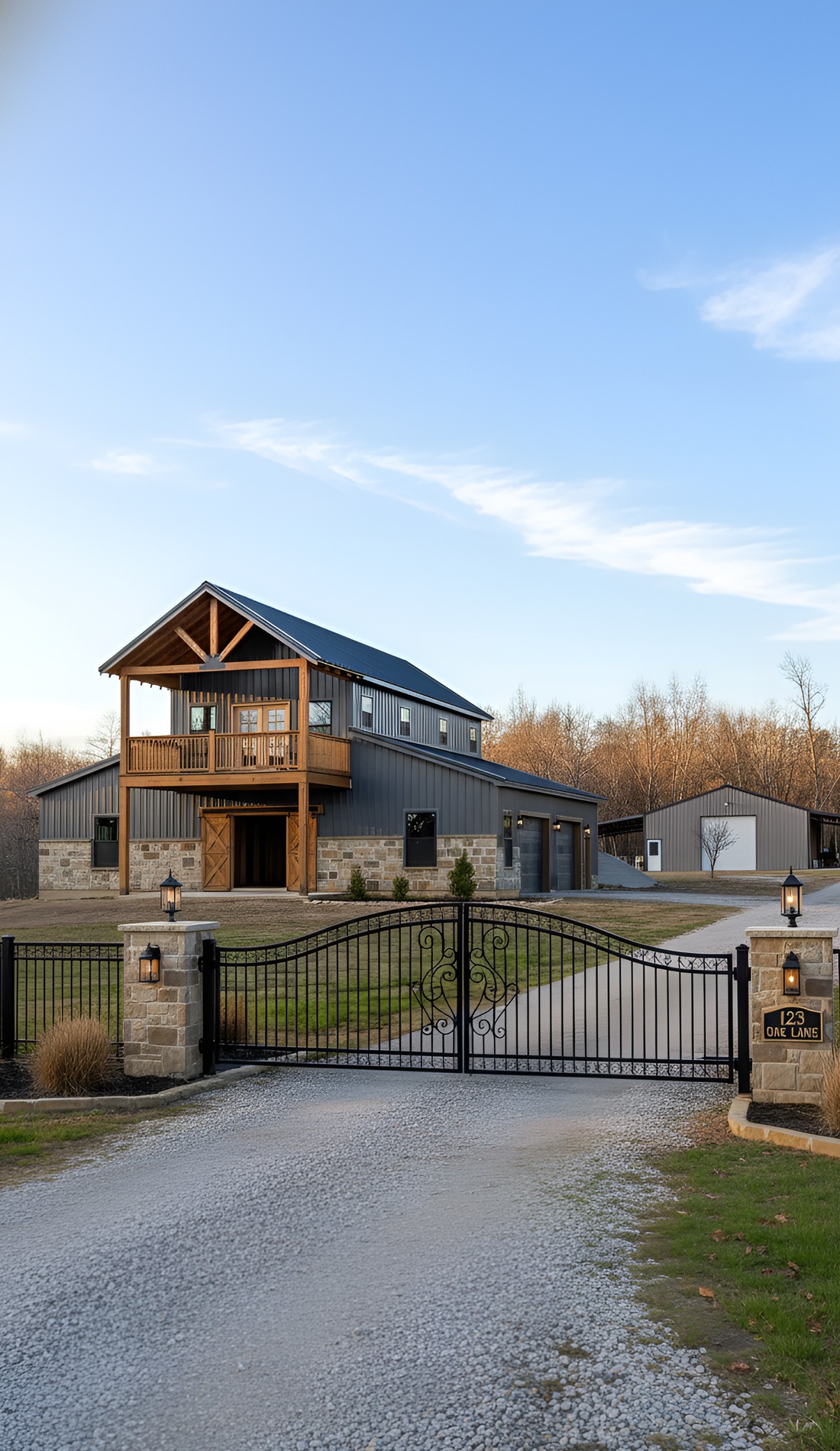 For a classic barndominium look, try timber columns on stone bases with a black metal gate. For a cleaner design, use simple masonry pillars with sleek lighting. This feature works especially well on larger lots where the driveway begins far from the house.