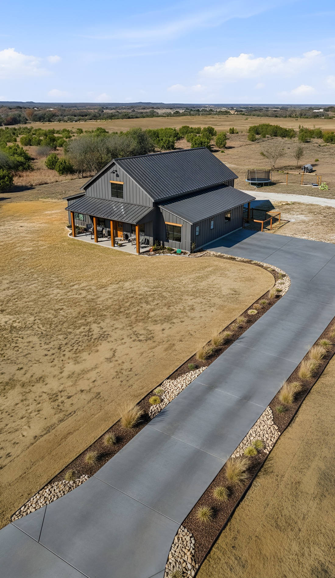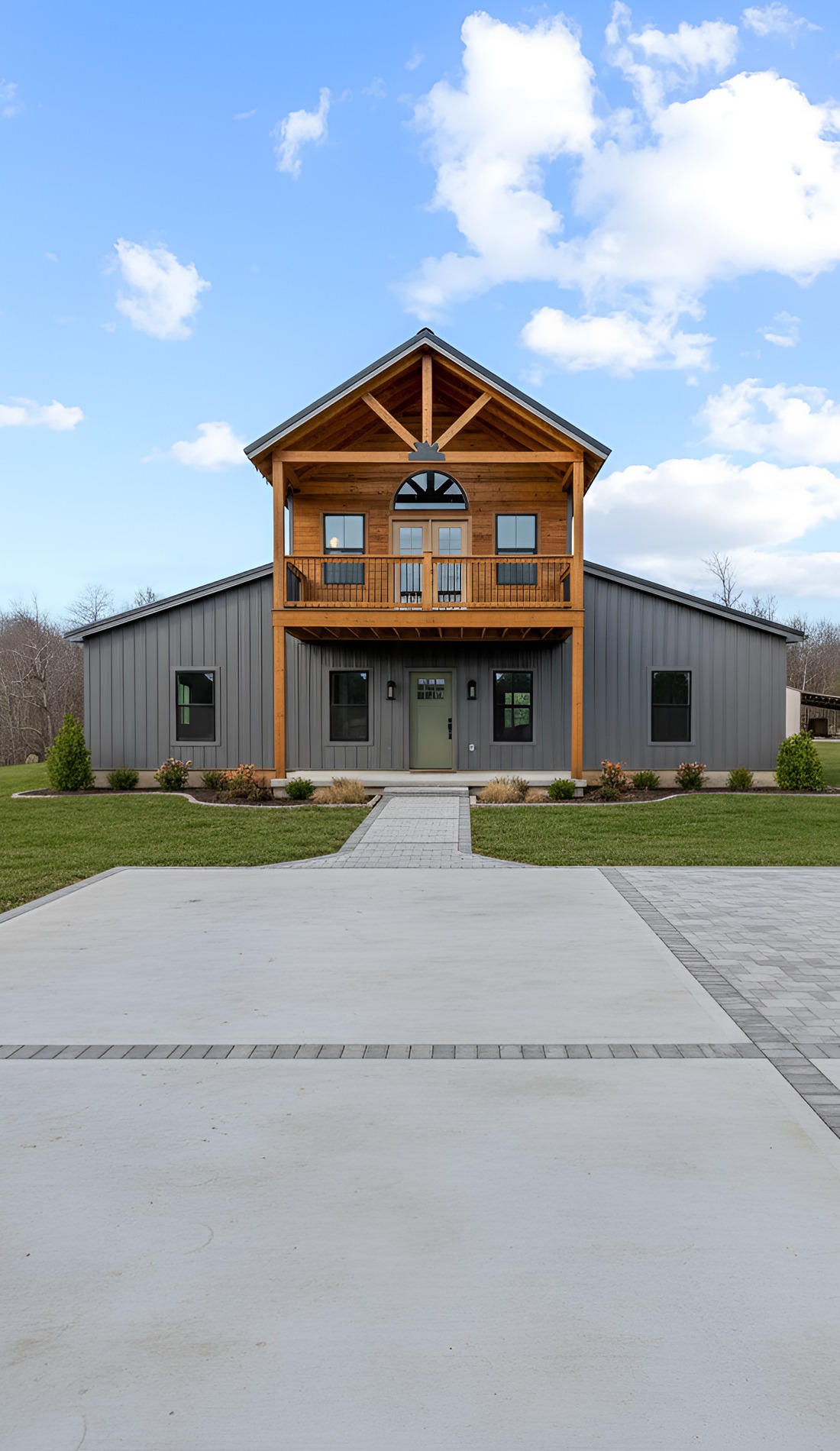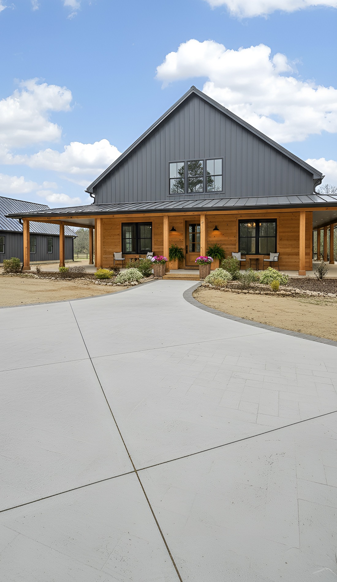 If you want your barndominium to lean modern, a concrete driveway is a strong match. It looks clean, neat, and crisp. It also pairs well with black window frames, metal roofs, minimalist landscaping, and sleek garage doors.