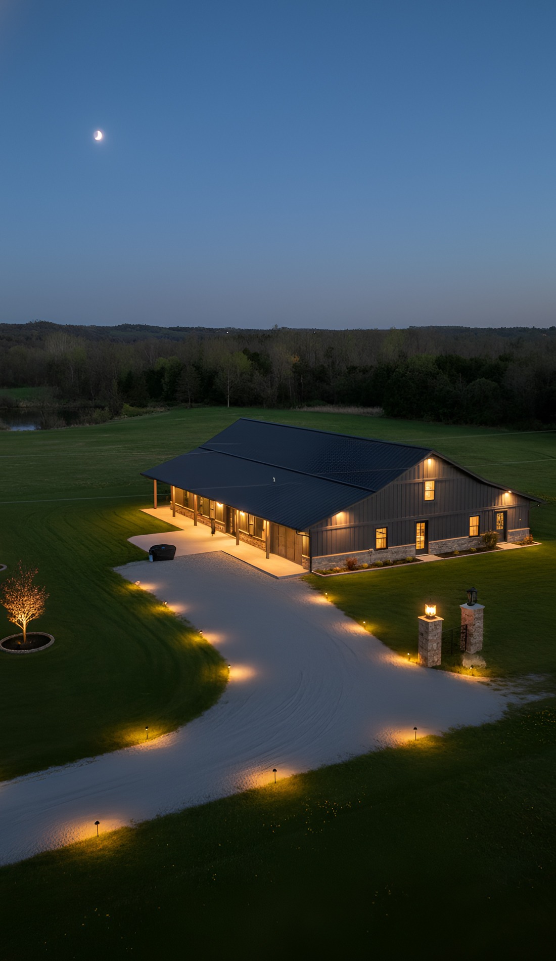 Driveway lighting does more than improve safety. It also makes a barndominium glow after sunset. That soft light along the drive can turn a simple approach into something warm and memorable.