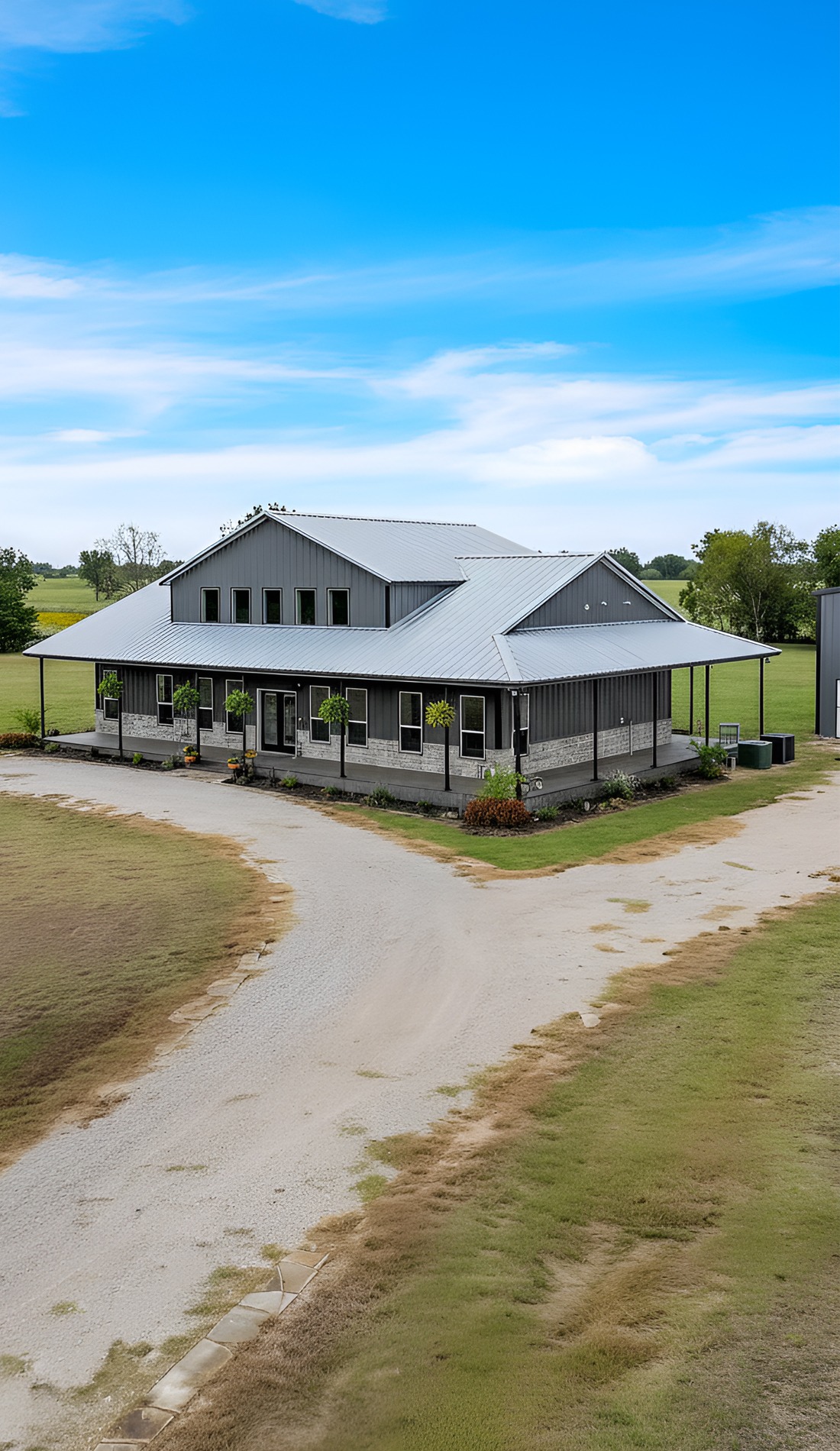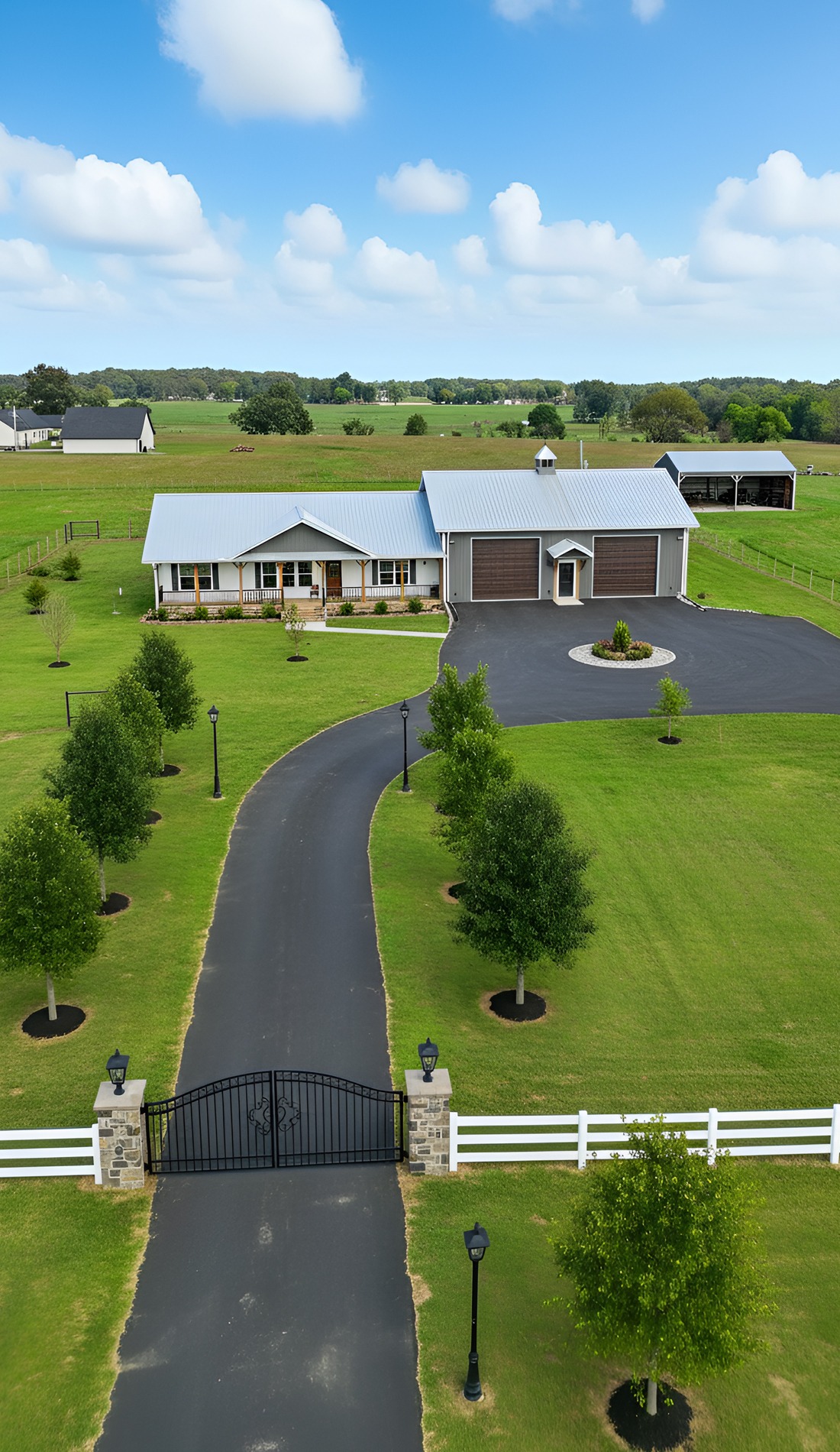 If your barndominium sits back from the road, a long winding driveway can make the approach feel special. Instead of a straight shot, the gentle curves build interest and drama. They also help the home feel tucked into the landscape in a more natural way.