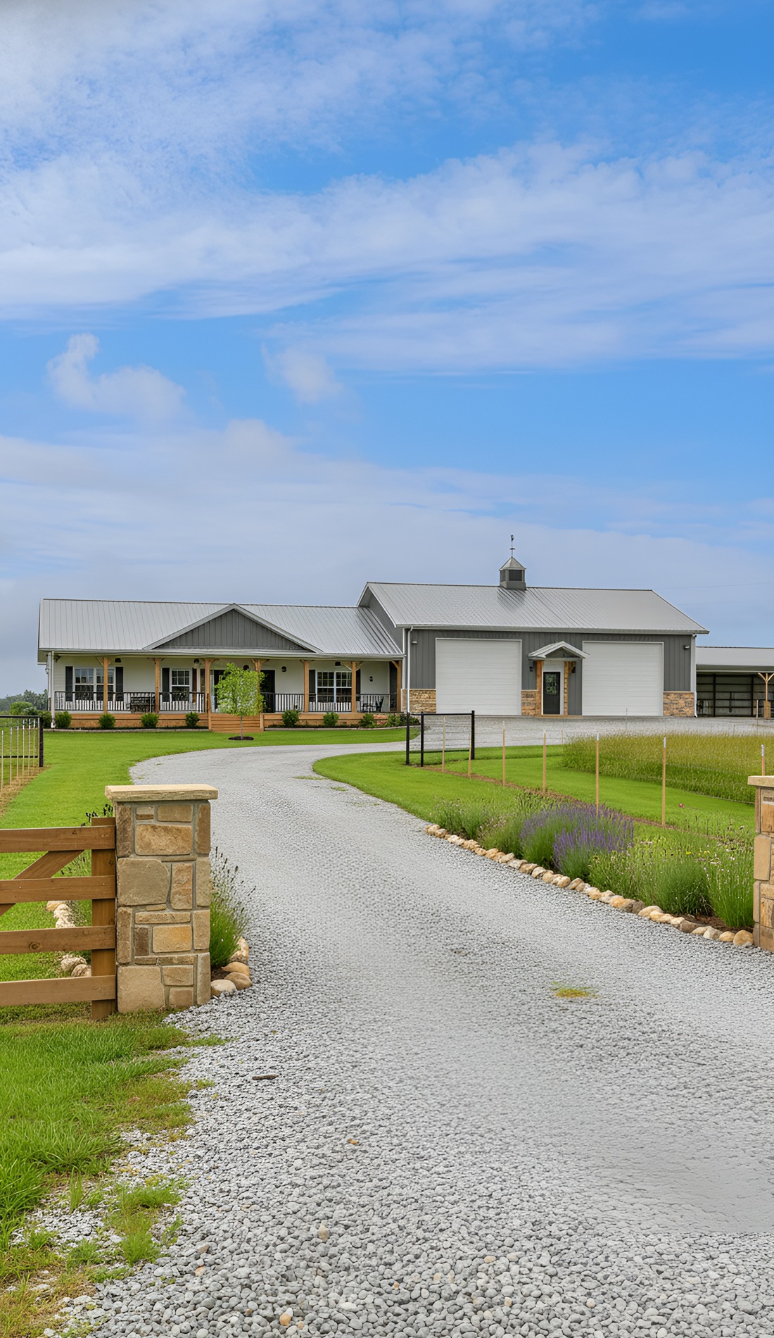 Gravel has texture. It softens the hard lines of metal siding and large garage doors. It also adds that familiar country look many homeowners want. Plus, it is budget-friendly compared to many other materials, which makes it a smart option for larger lots.