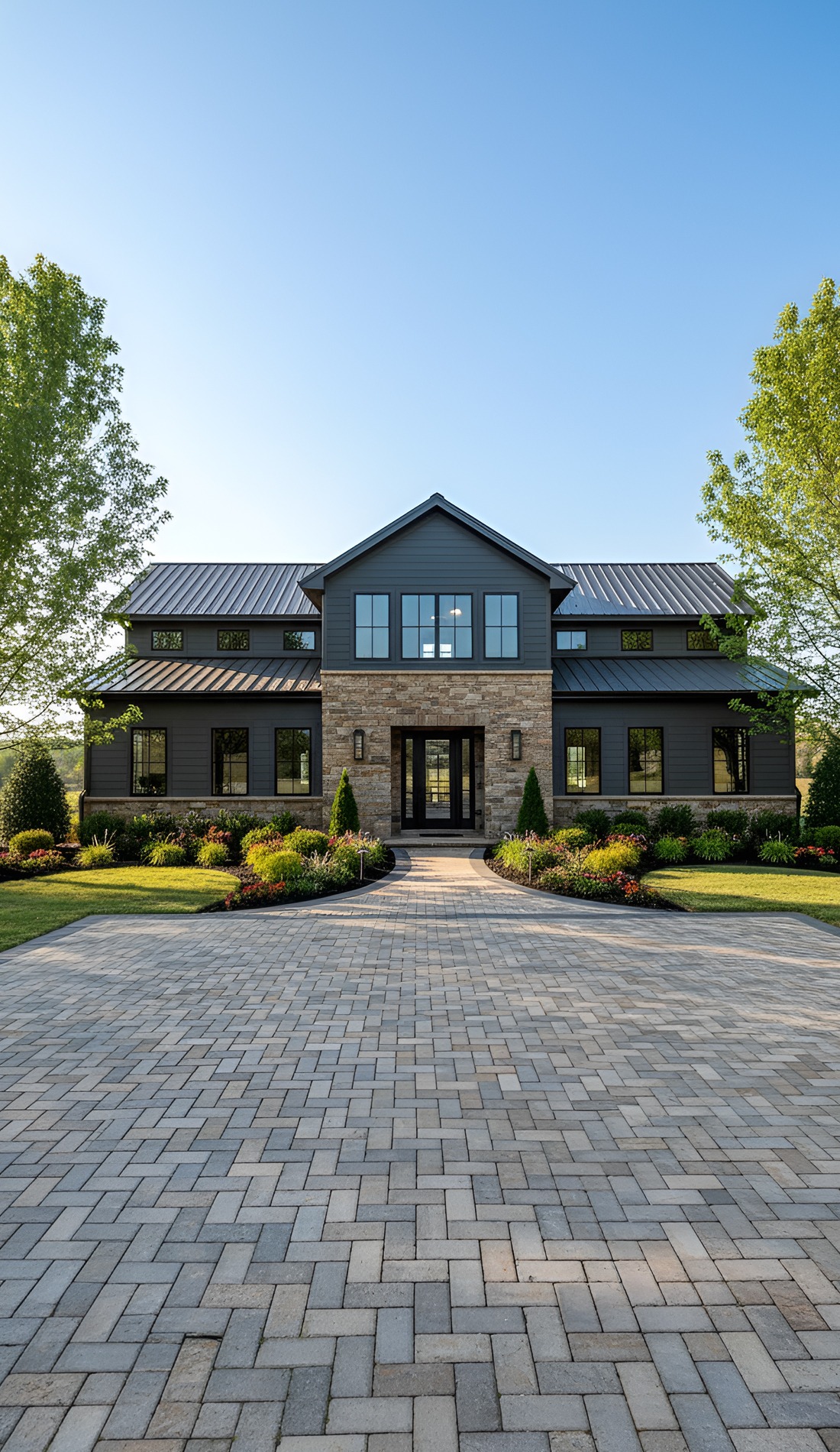 This driveway style can add visual warmth to a barndominium, especially if the house feels a bit stark or industrial. The pattern brings in texture. The color adds depth. Together, they help the driveway feel like part of the design, not just a utility surface.