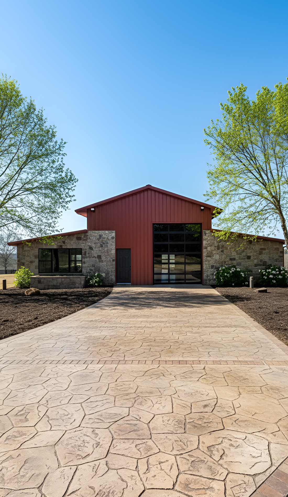 Stamped concrete works well with rustic, farmhouse, and transitional barndominium styles.