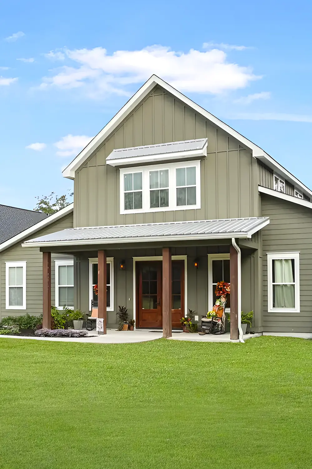 Double doors feel grand. They draw attention. They make the home feel more custom. And when paired with a simple porch roof, they become the main design moment.