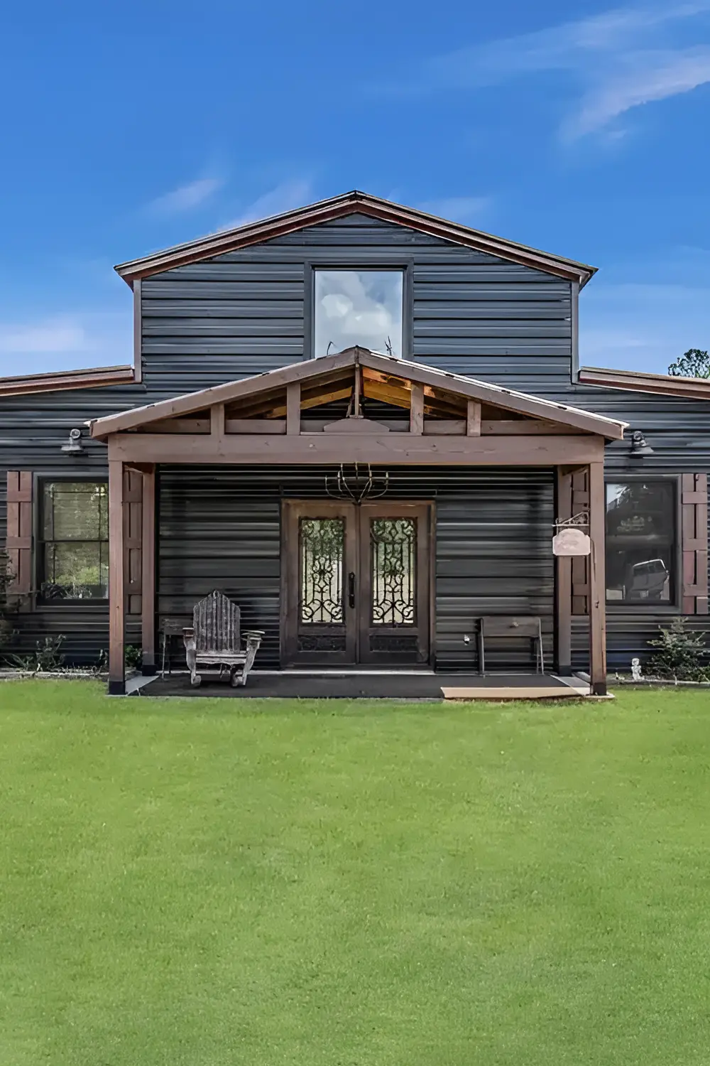 This look works great if your barndominium exterior already has black windows, charcoal roofing, or white siding. A black-and-wood porch ties those elements together in a polished way.