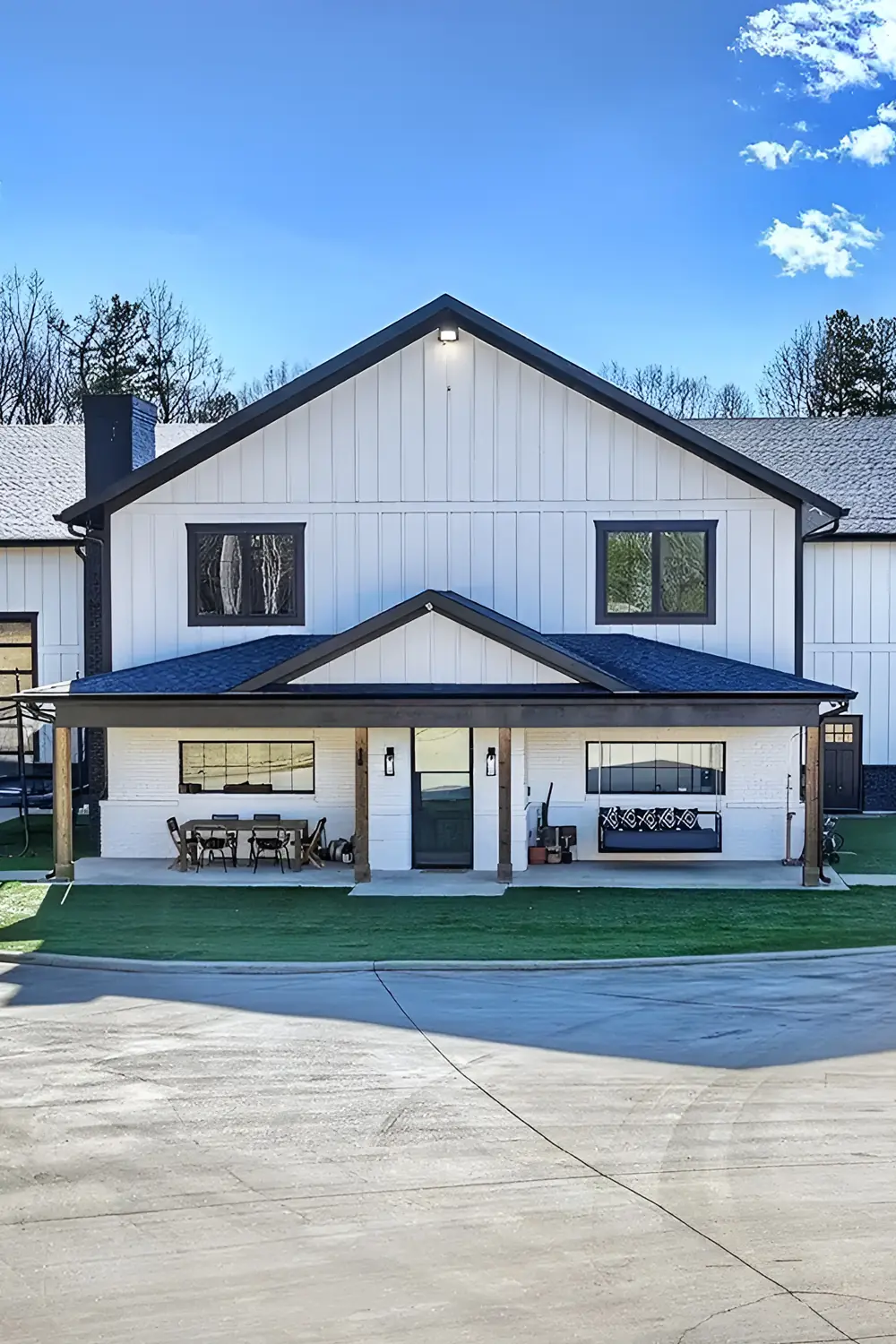 It works especially well with white or light-colored siding, black windows, and natural wood accents. The contrast feels crisp, but the overall mood still feels casual and welcoming.