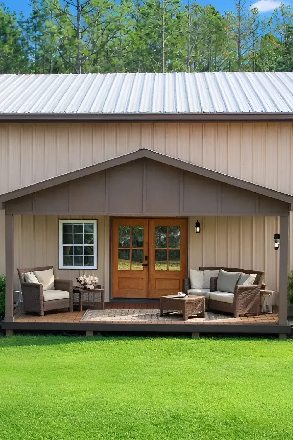 A farmhouse-style porch uses simple white posts, relaxed seating, and timeless details. On a barndominium, this style helps soften industrial edges and adds that homey touch many owners want.