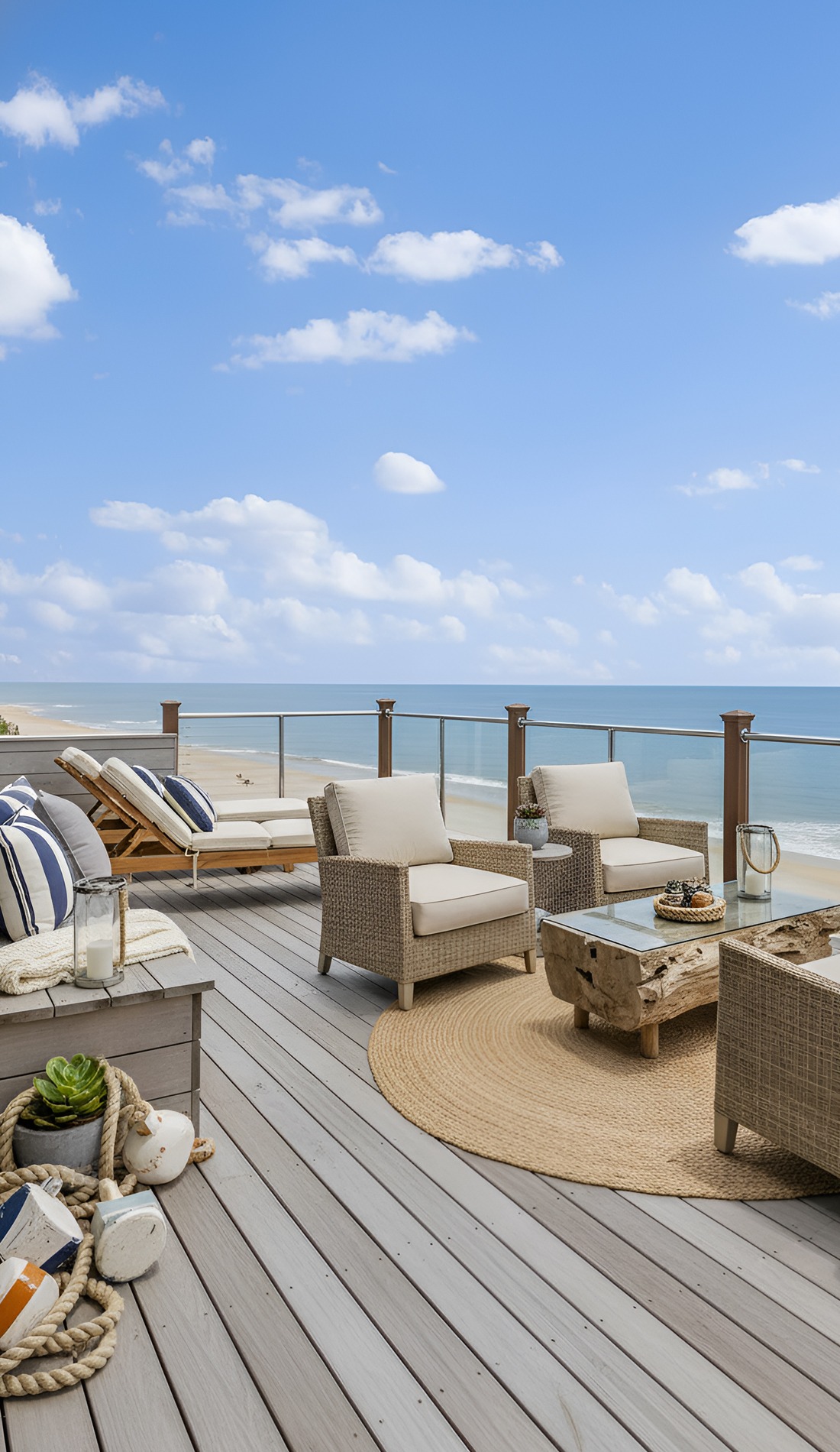The cue here is casual layering. Do not overstuff the furniture with too many pillows. Two or three per seating zone is often enough. Drape a throw over one chair or fold it neatly in a basket. These small touches make the deck feel lived in, which is exactly what gives coastal spaces their charm.