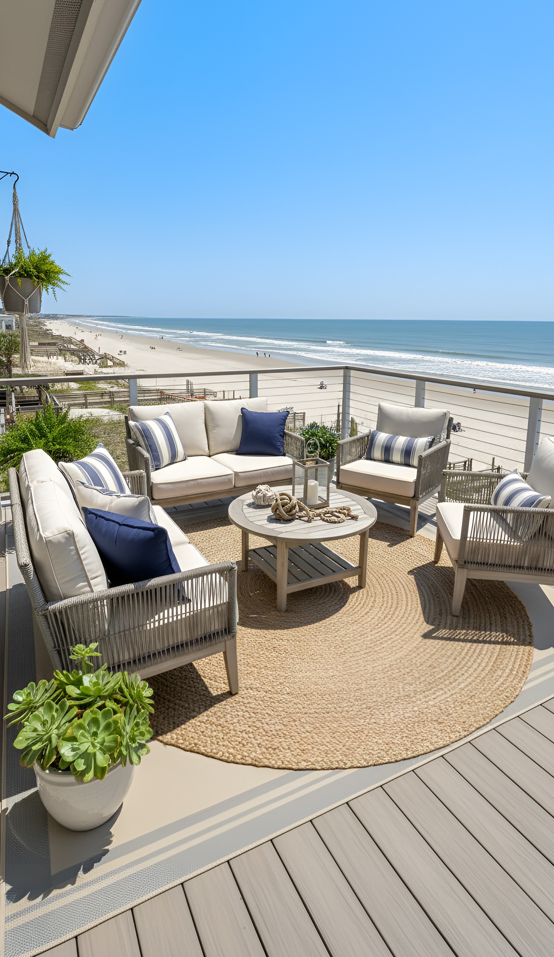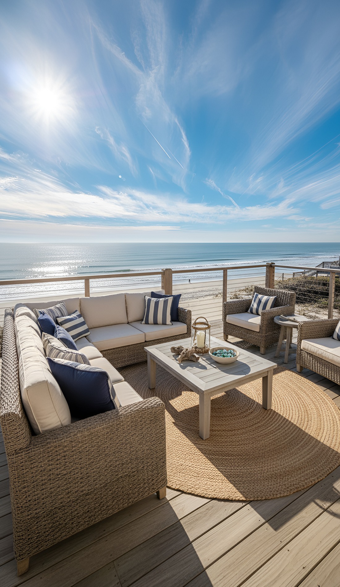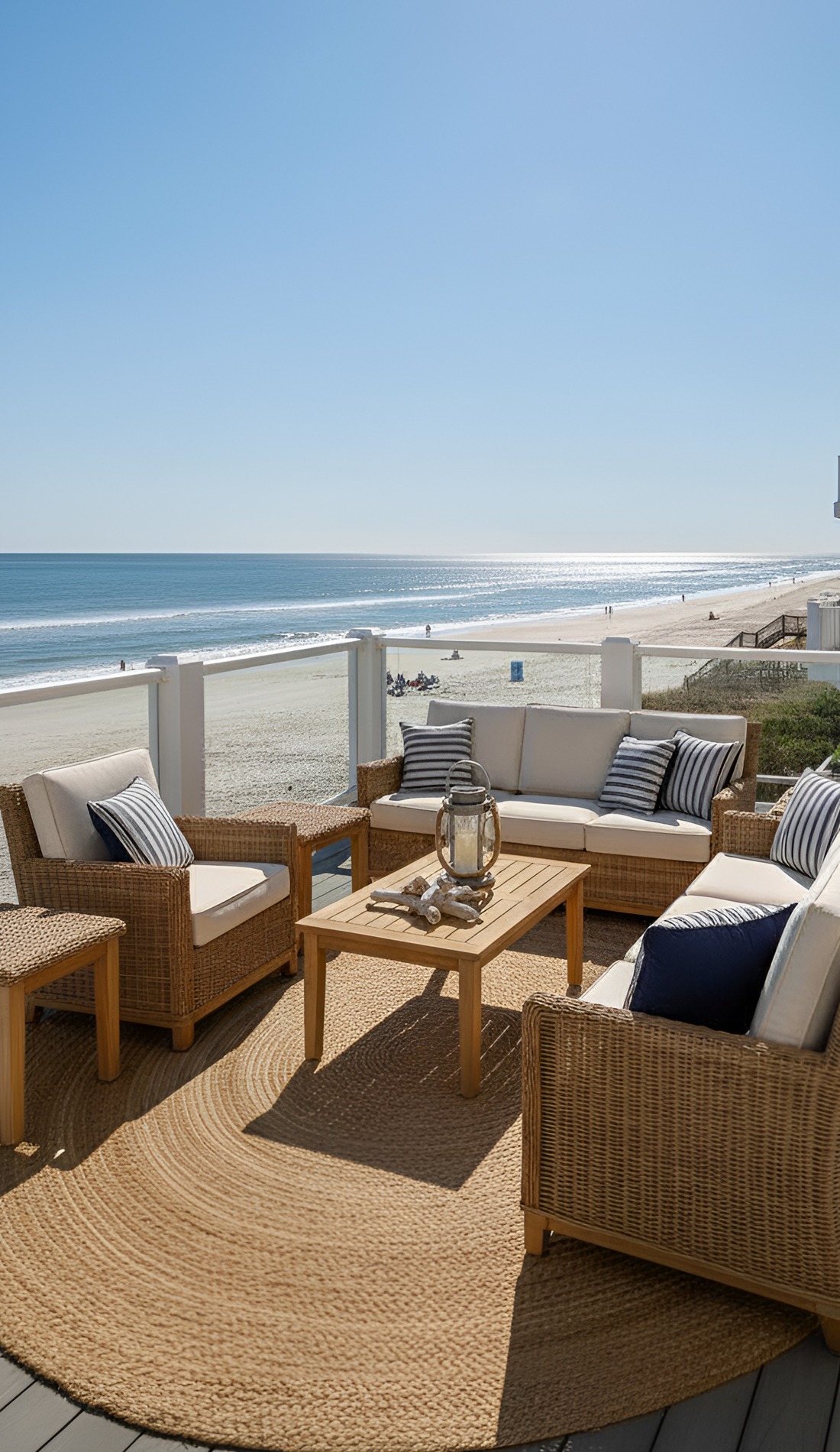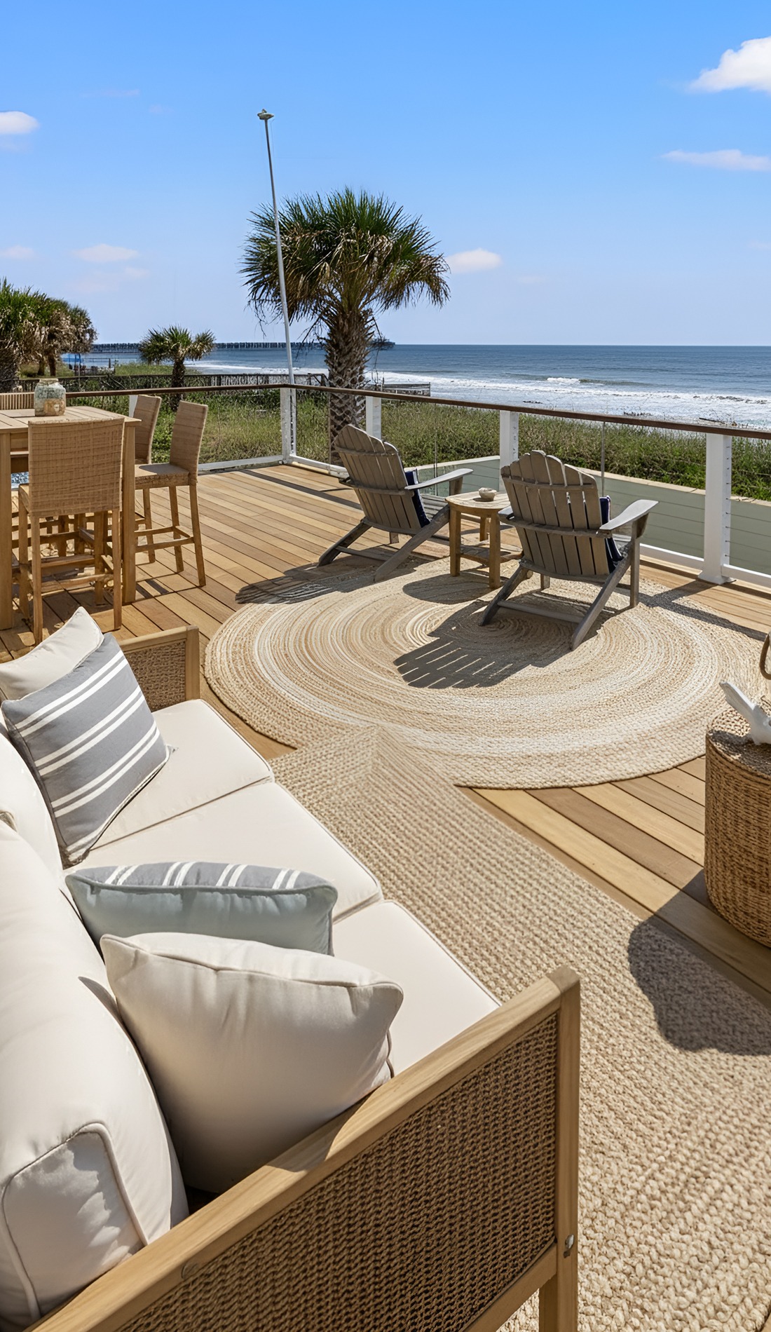 Few things make a beach house deck feel finished faster than an outdoor rug.
