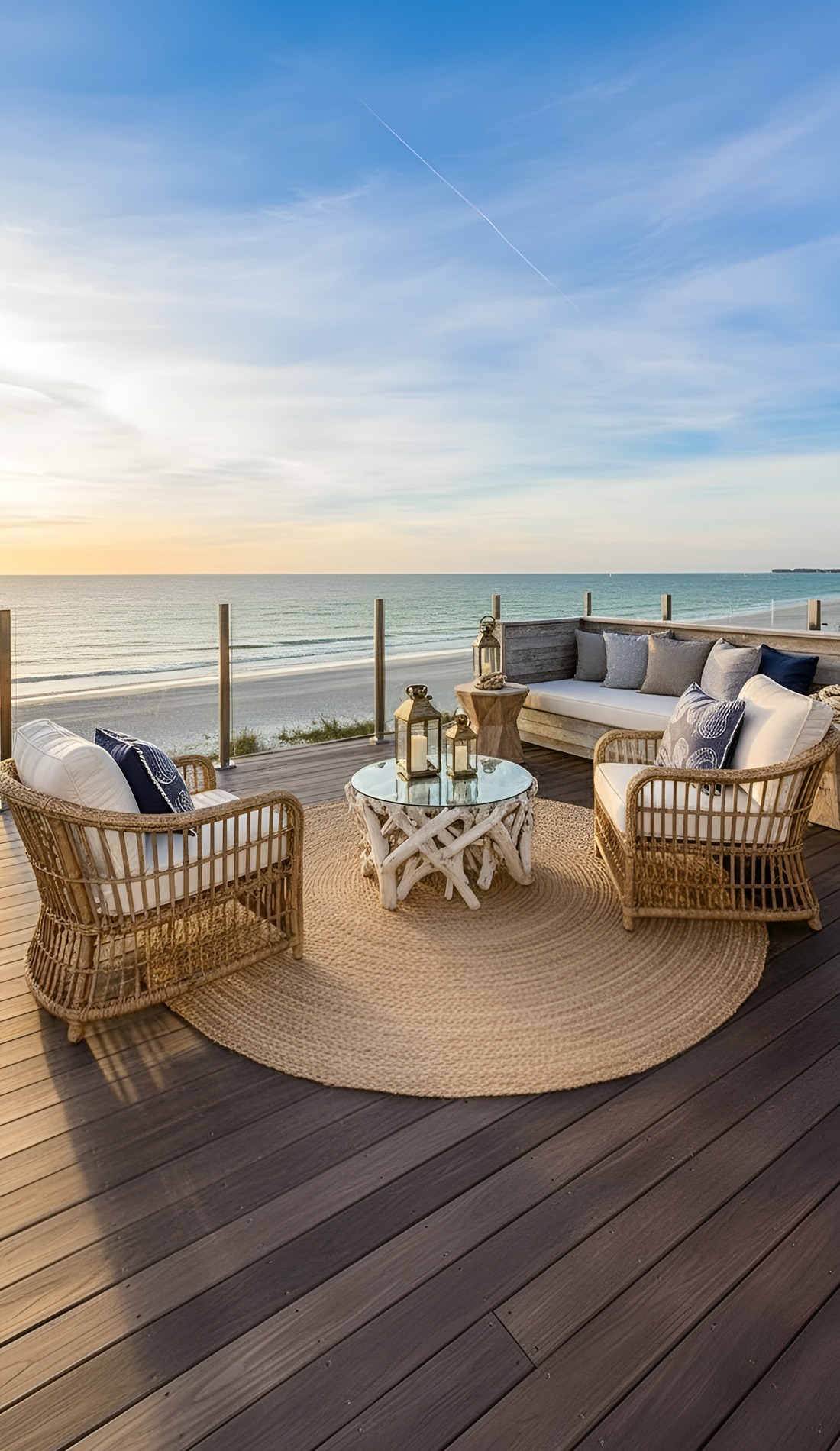 Lanterns add warmth, charm, and a soft glow that makes the deck feel cozy after sunset. They also suit beach house style perfectly because they echo the simple romance of old coastal homes and waterfront evenings.