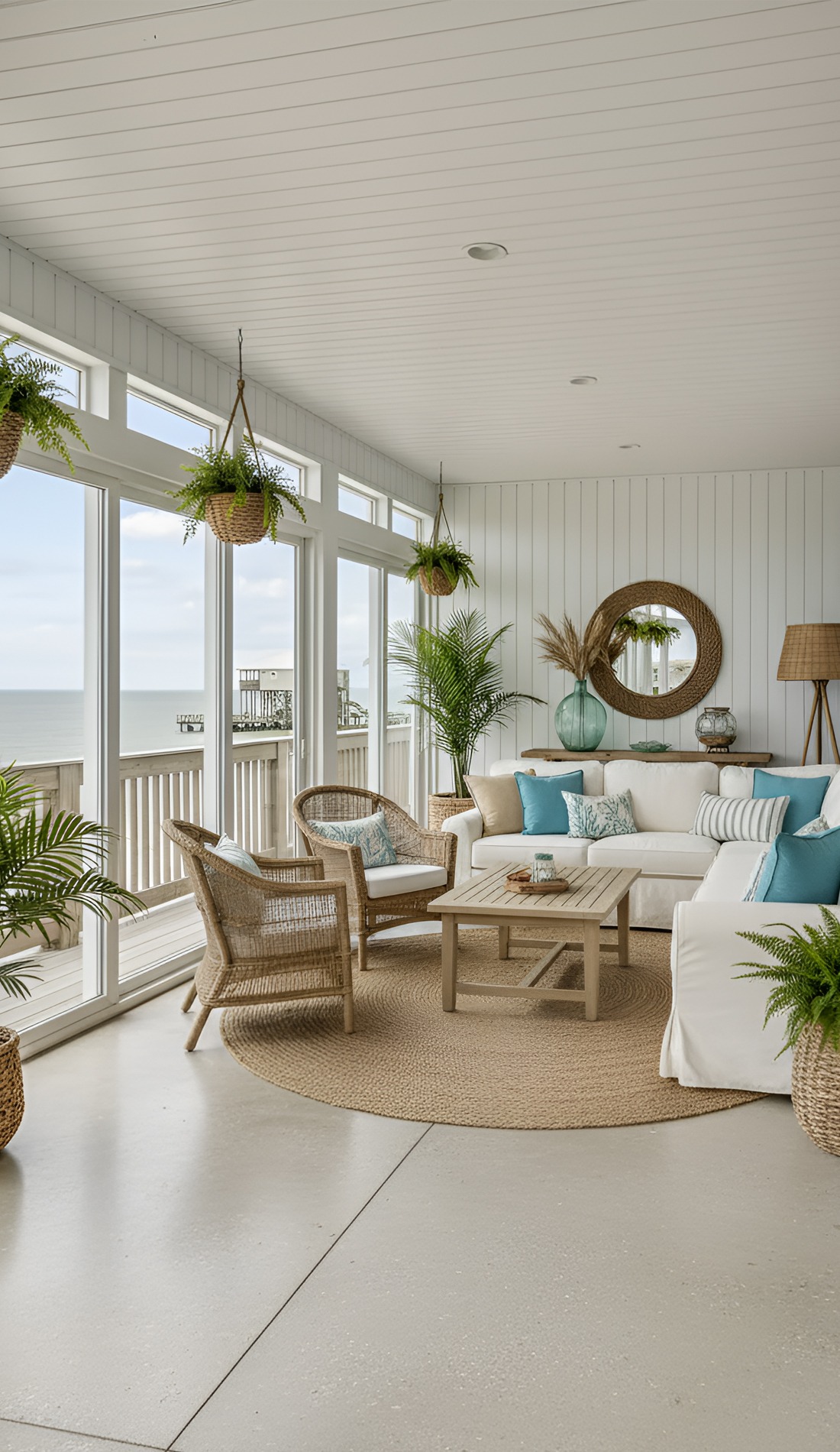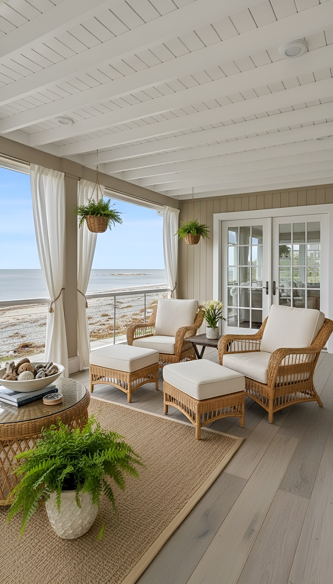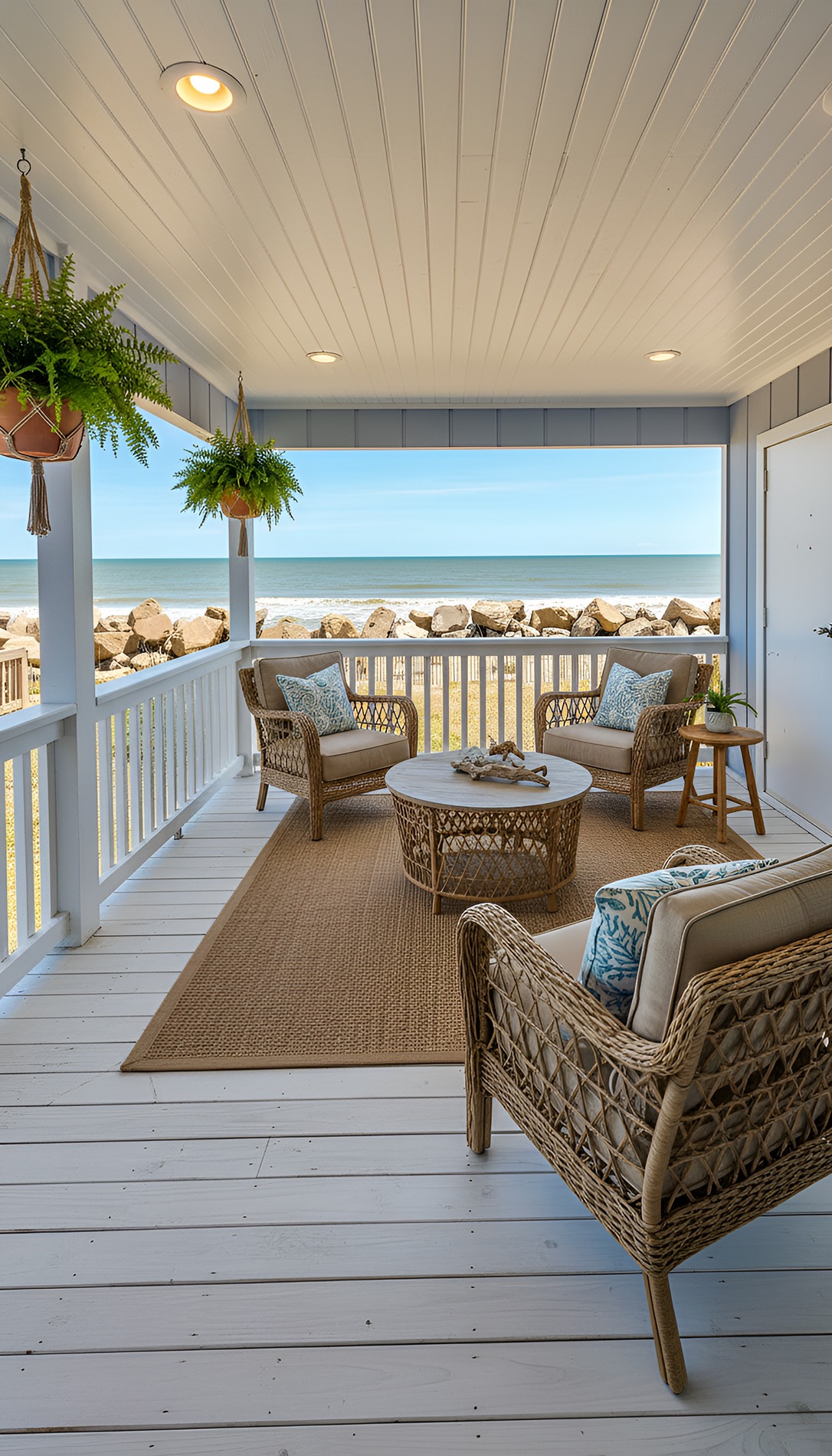 These materials have a natural, woven look that feels casual and breezy. They add texture without making the porch feel heavy. That matters because beach house design works best when the room feels open and unfussy.