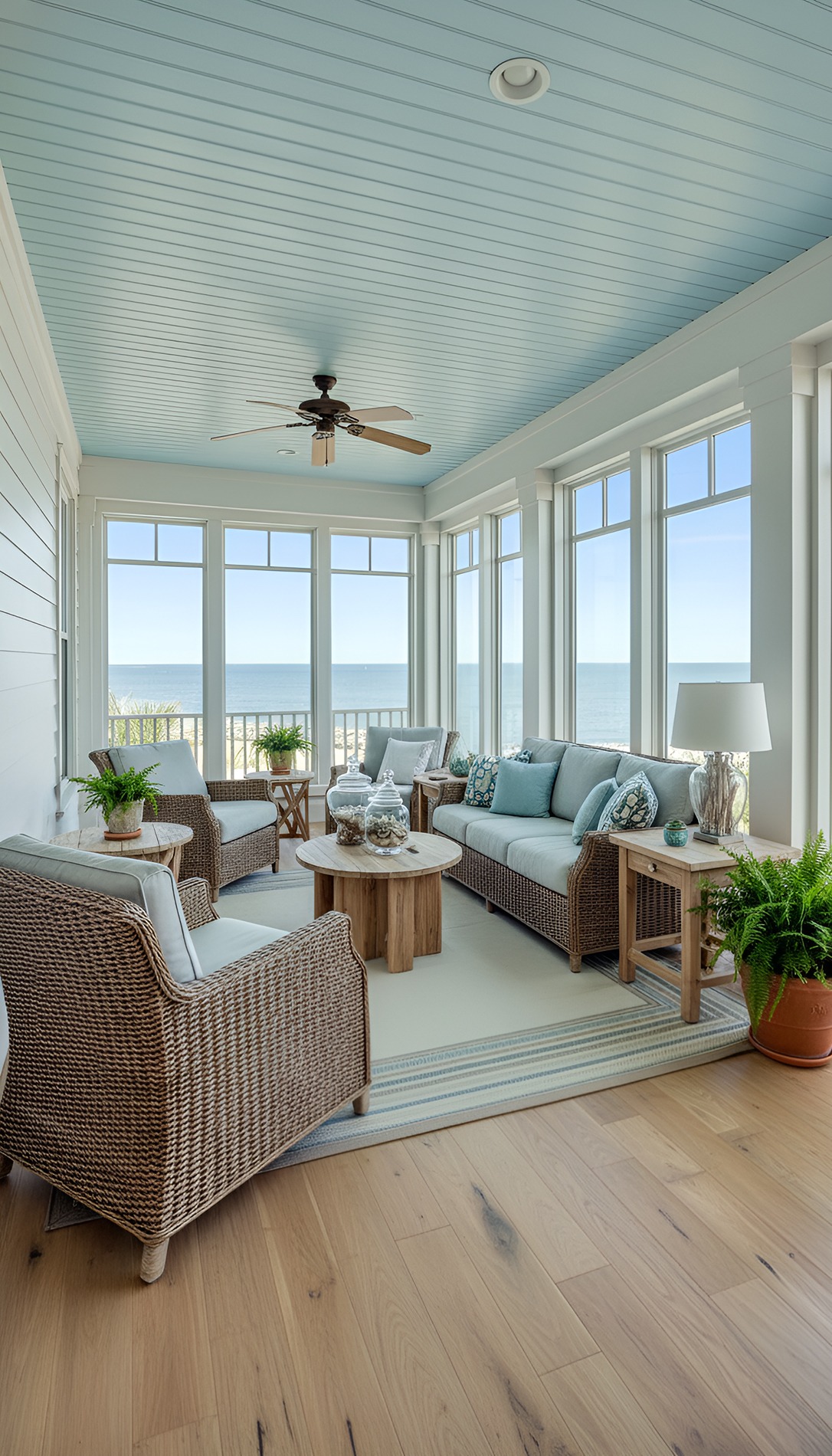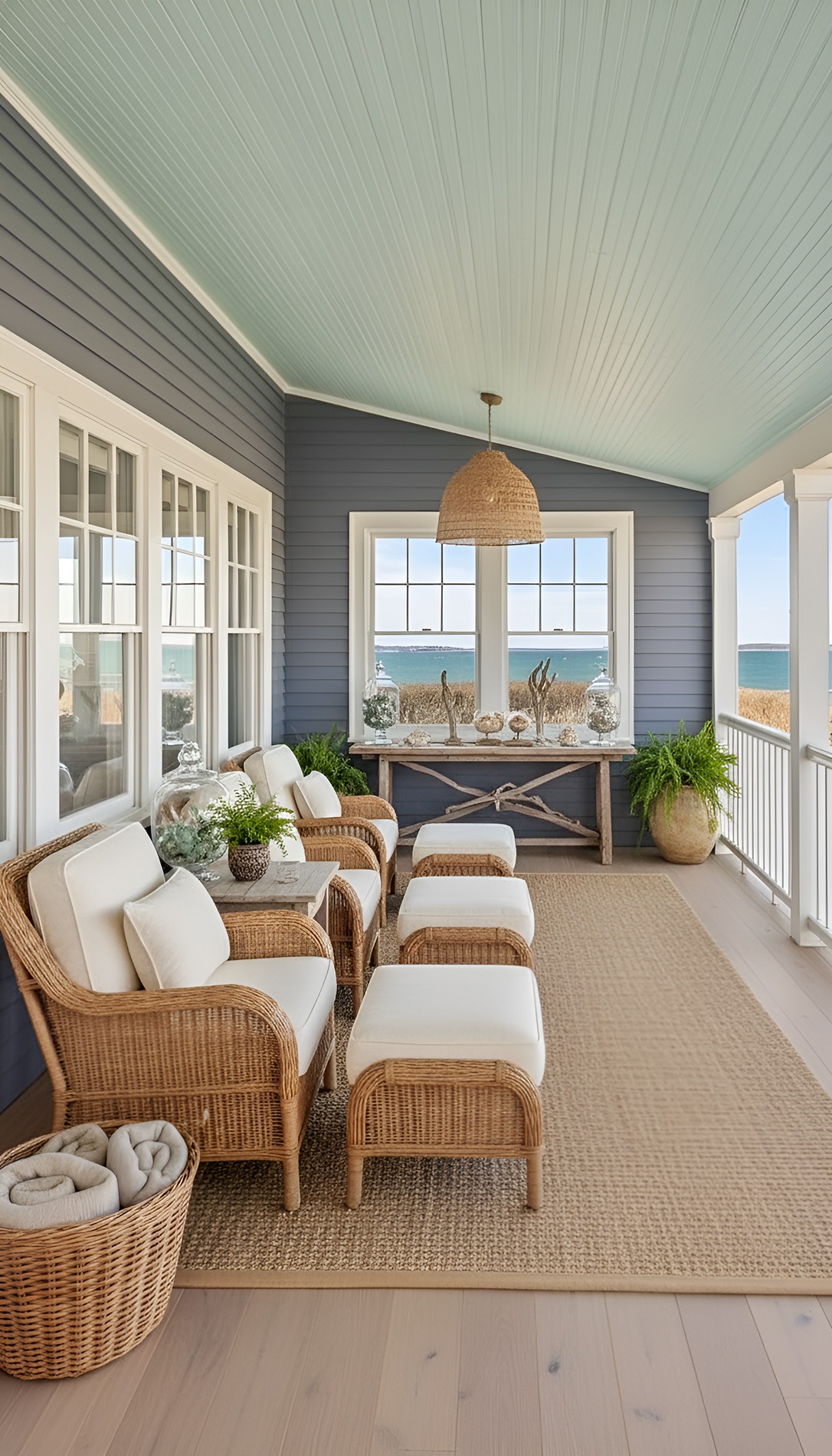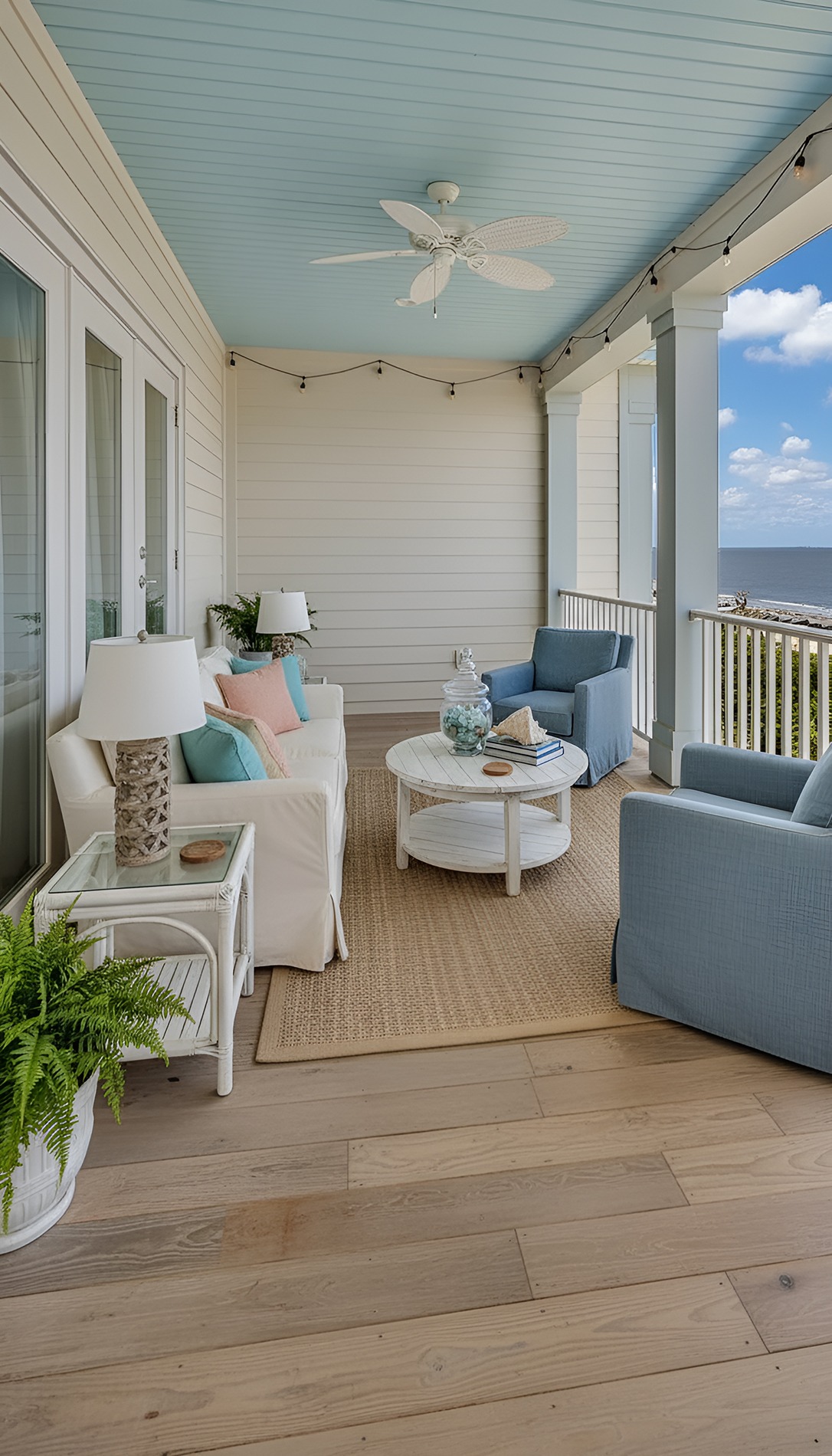 Choose two or three main tones and repeat them throughout the porch. Use white for trim or furniture, natural tan for texture, and one soft ocean shade as an accent. This keeps the space calm instead of chaotic.