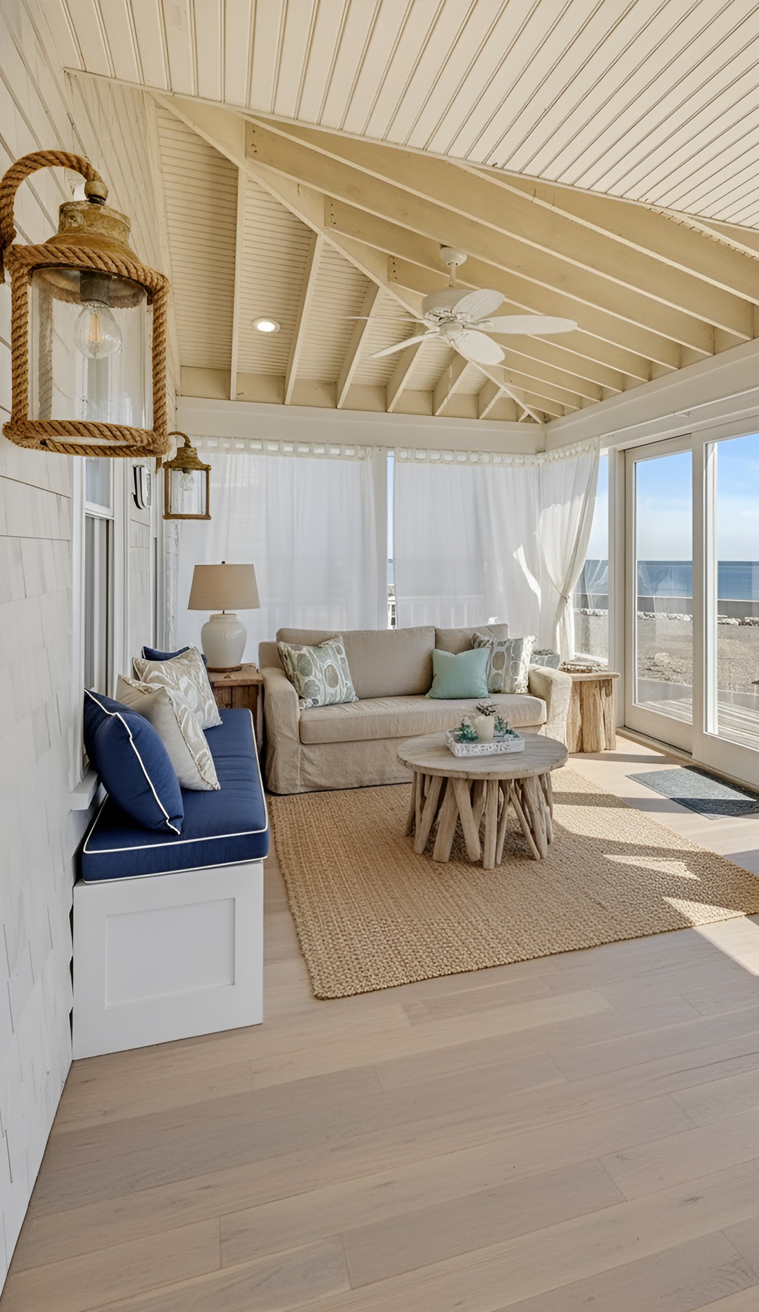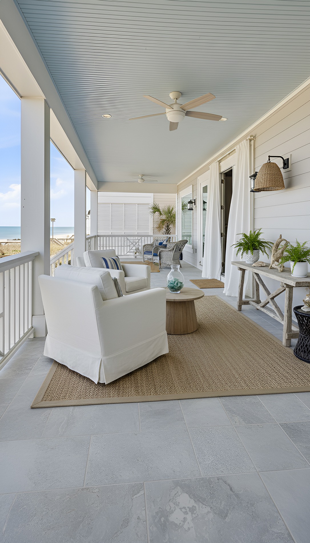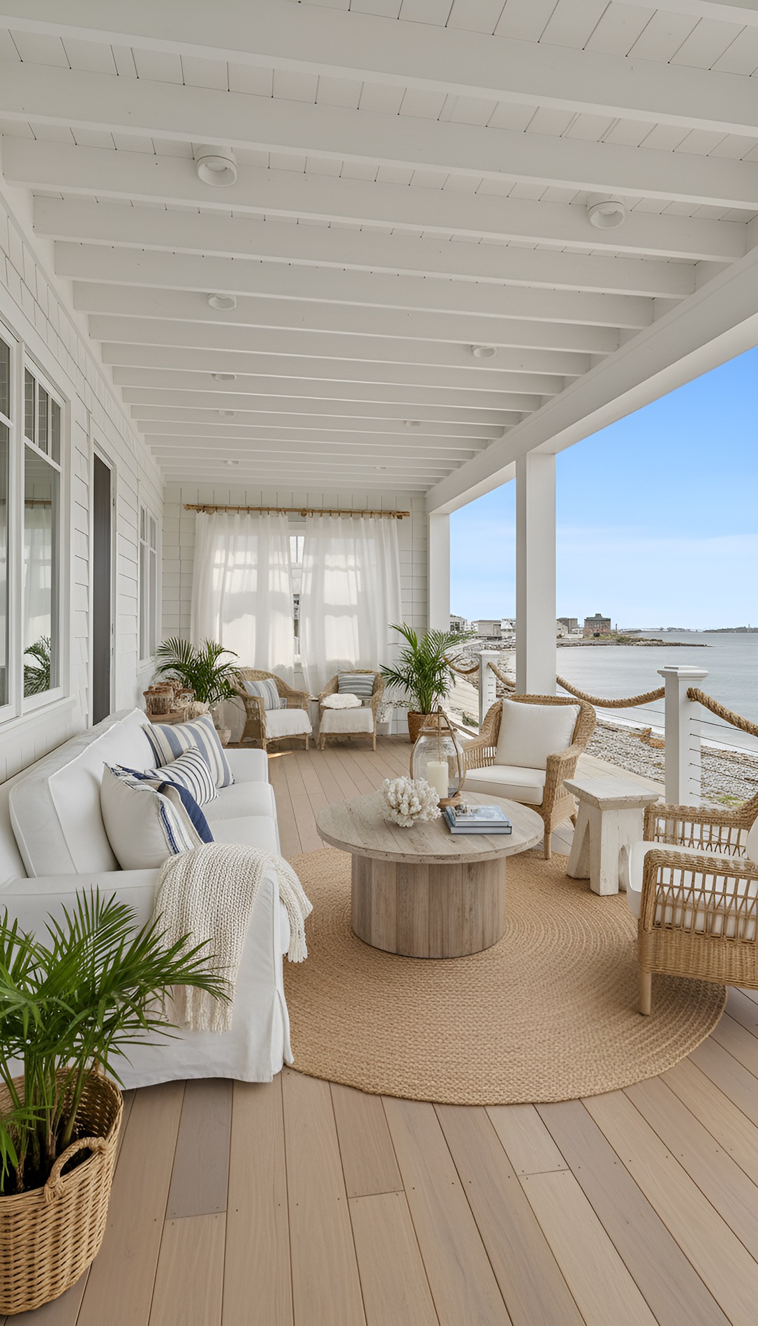 They soften the structure of the porch and make it feel more like a retreat. When they move with the breeze, they add that dreamy, vacation-like feeling that beach houses do so well. They can also provide shade and a little privacy without blocking the light completely.