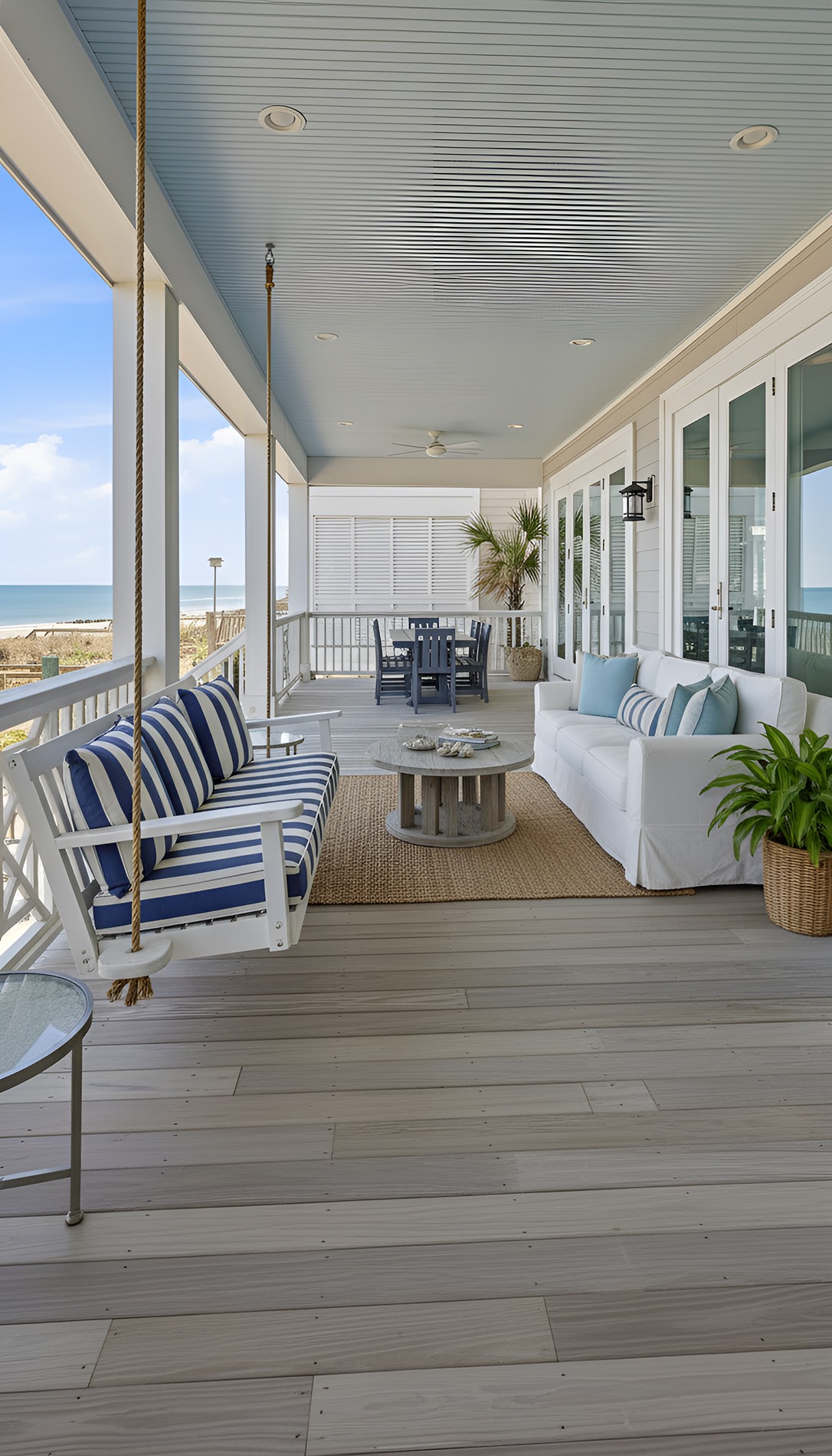 A swing brings movement, comfort, and a sense of nostalgia. It makes the porch feel more like a destination, not just a pass-through space. It also fits the mood of coastal living perfectly. After all, beach style is about slowing down.
