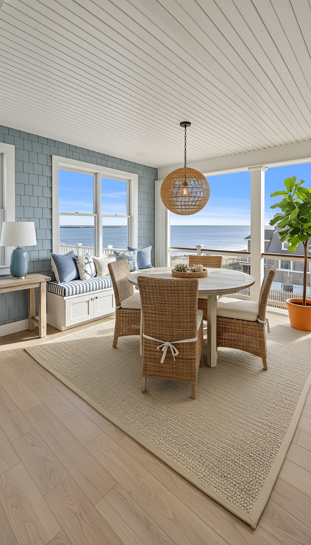 Keep the styling simple. Add a seat cushion, two to three pillows, and maybe a light throw for cooler evenings. Avoid overstuffing it. A beach house porch should still feel breezy and open.