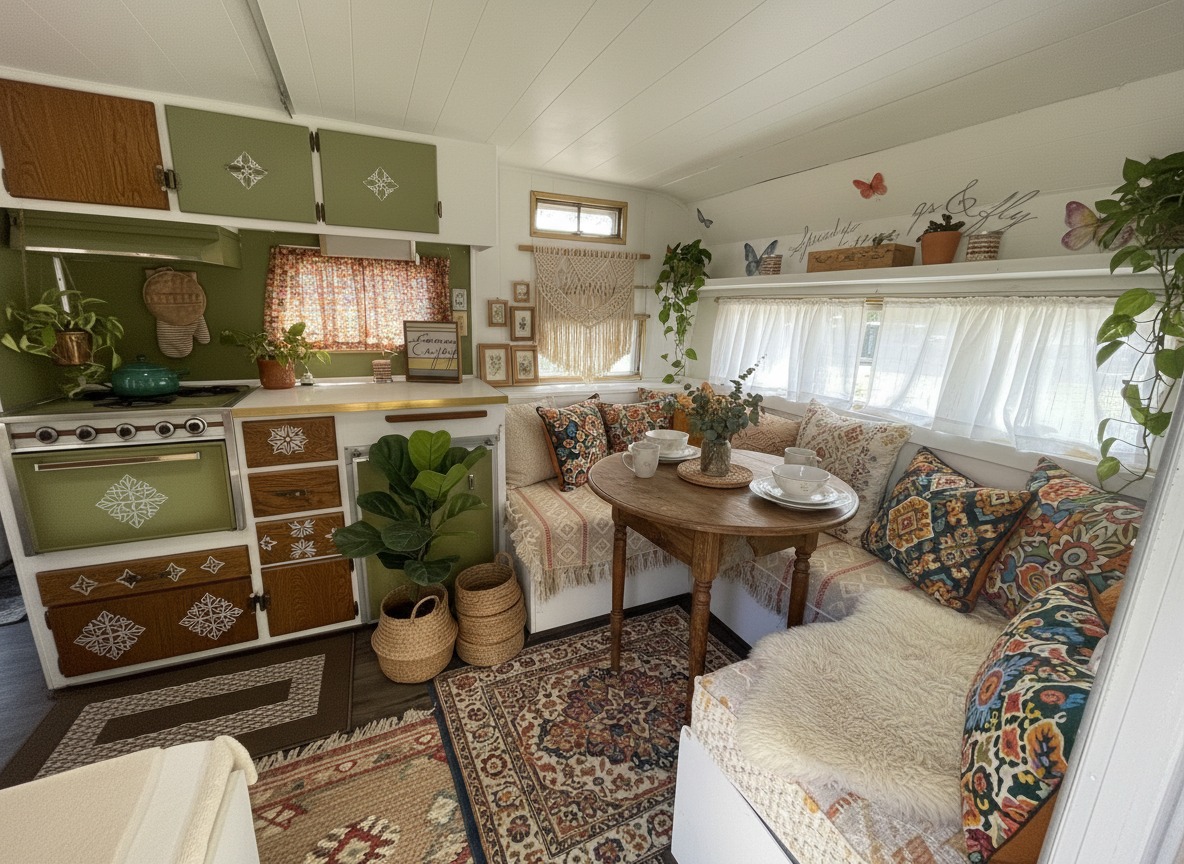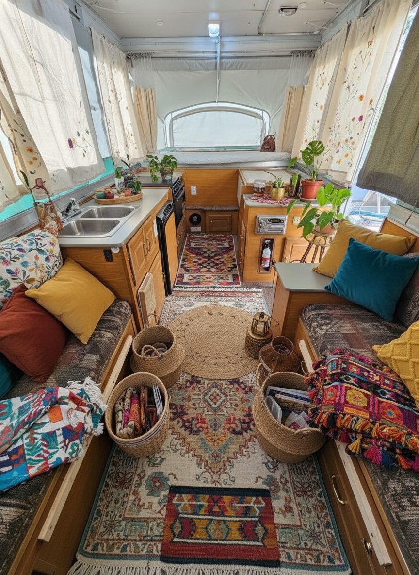 Picture this. You open your caravan door. A soft rug greets your feet. Light filters through linen curtains. A little plant sways near the window. And suddenly, your tiny space feels like a warm, creative hideout.
