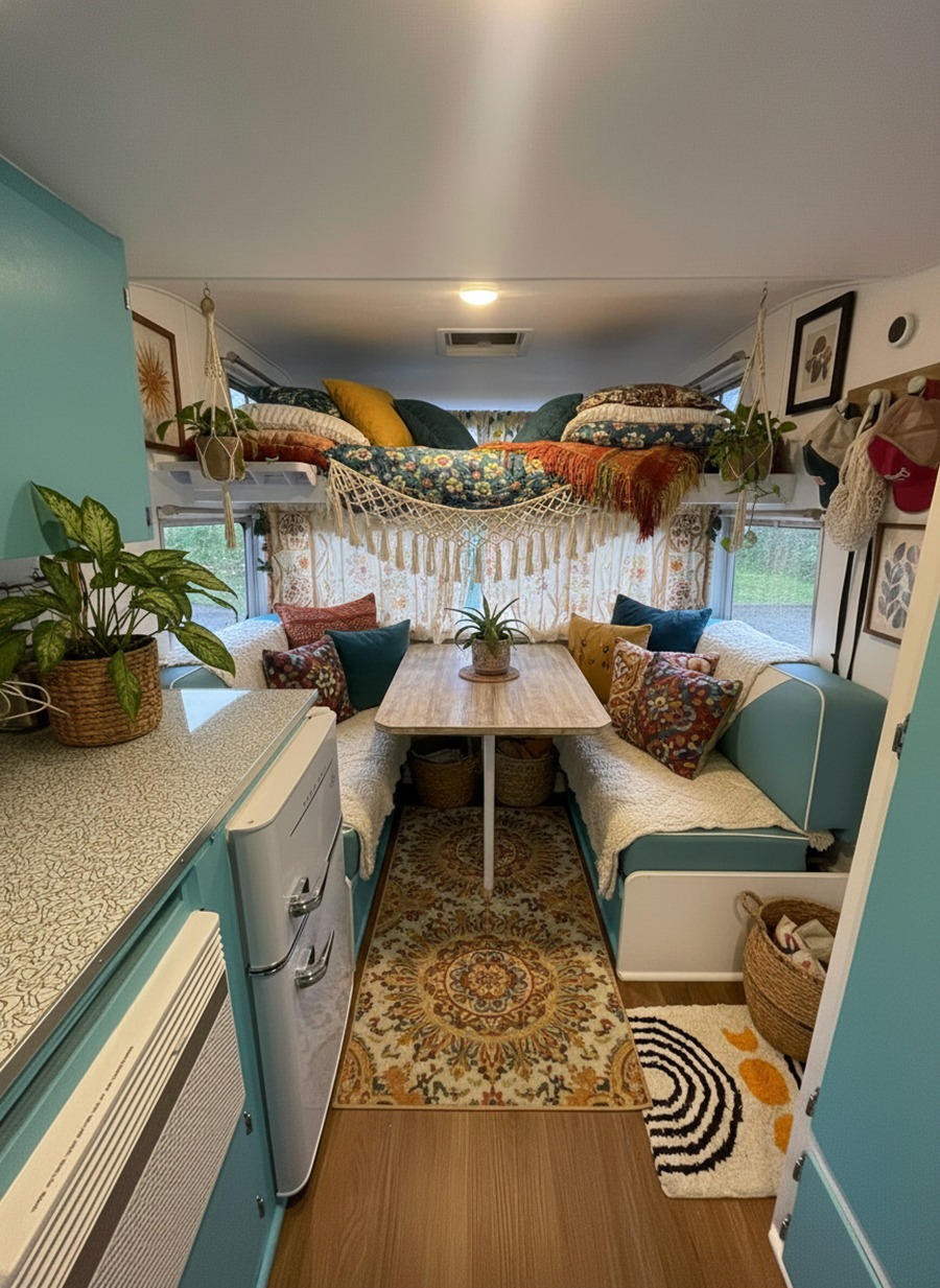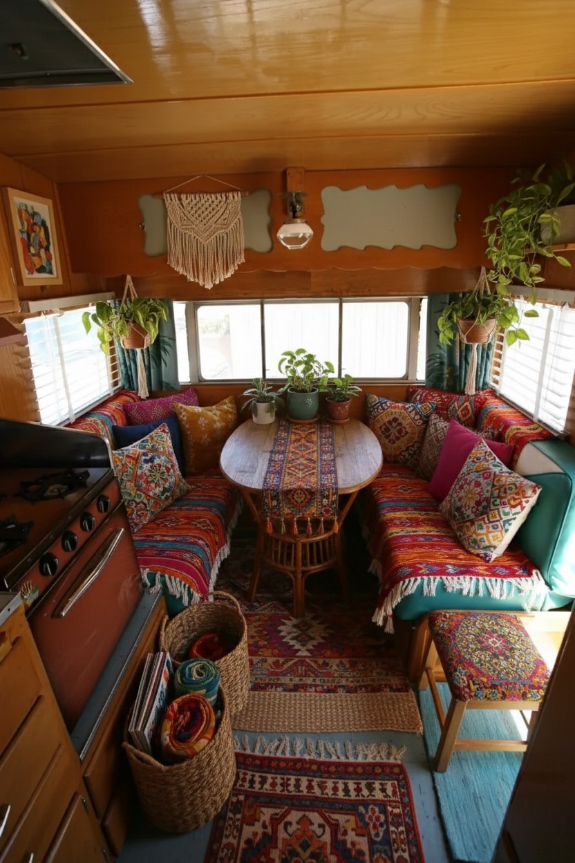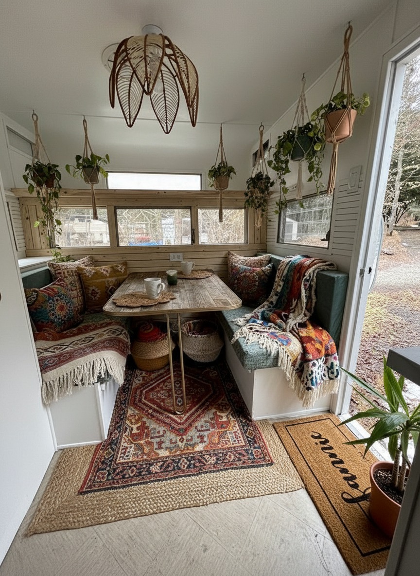 Boho style feels relaxed. So if your caravan has a dinette, soften it. Add a seat cushion. Add pillows. Add a throw. Suddenly, it feels like a lounge nook.