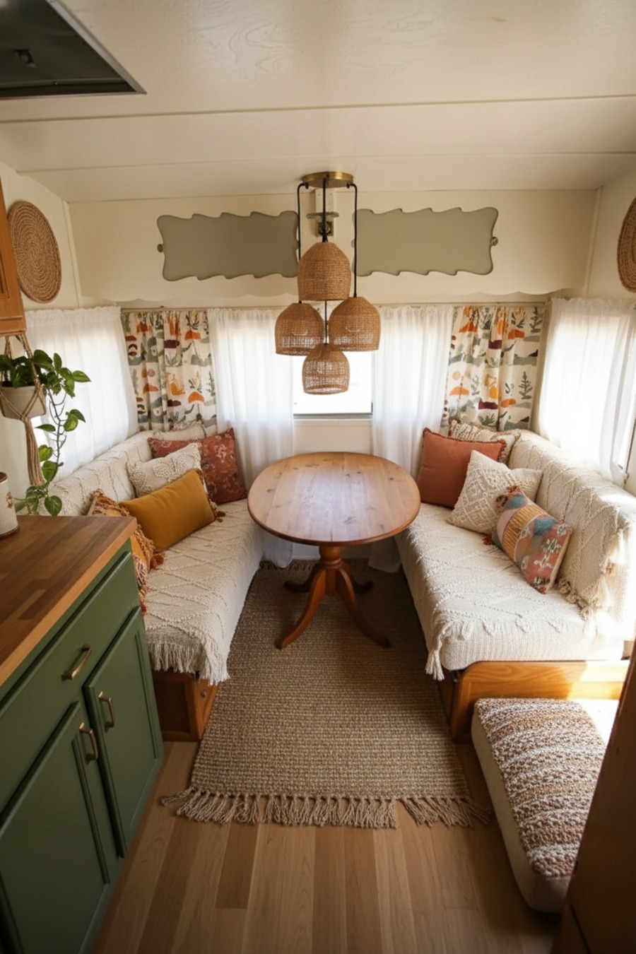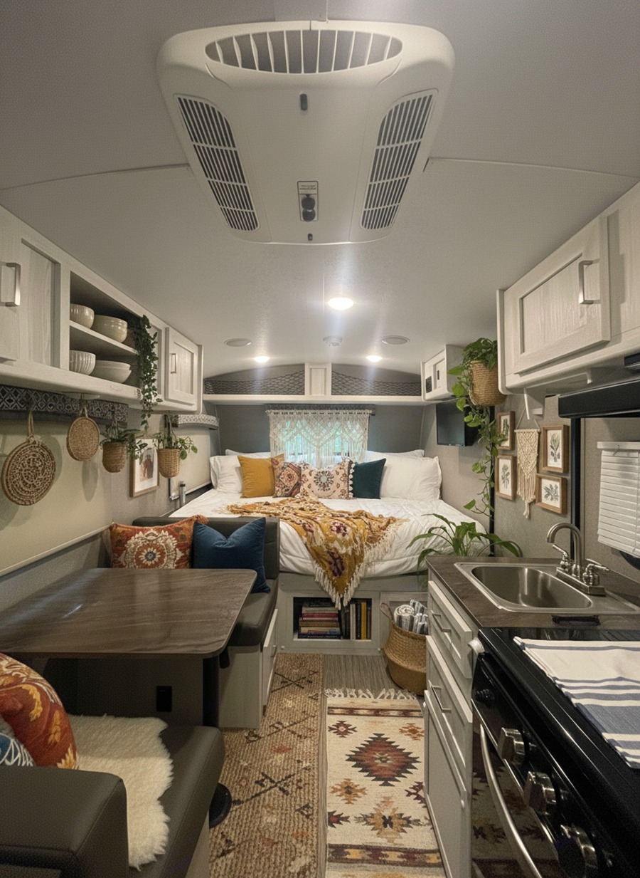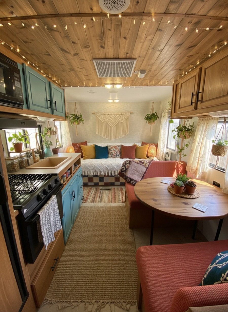 Boho style feels relaxed. So if your caravan has a dinette, soften it. Add a seat cushion. Add pillows. Add a throw. Suddenly, it feels like a lounge nook.