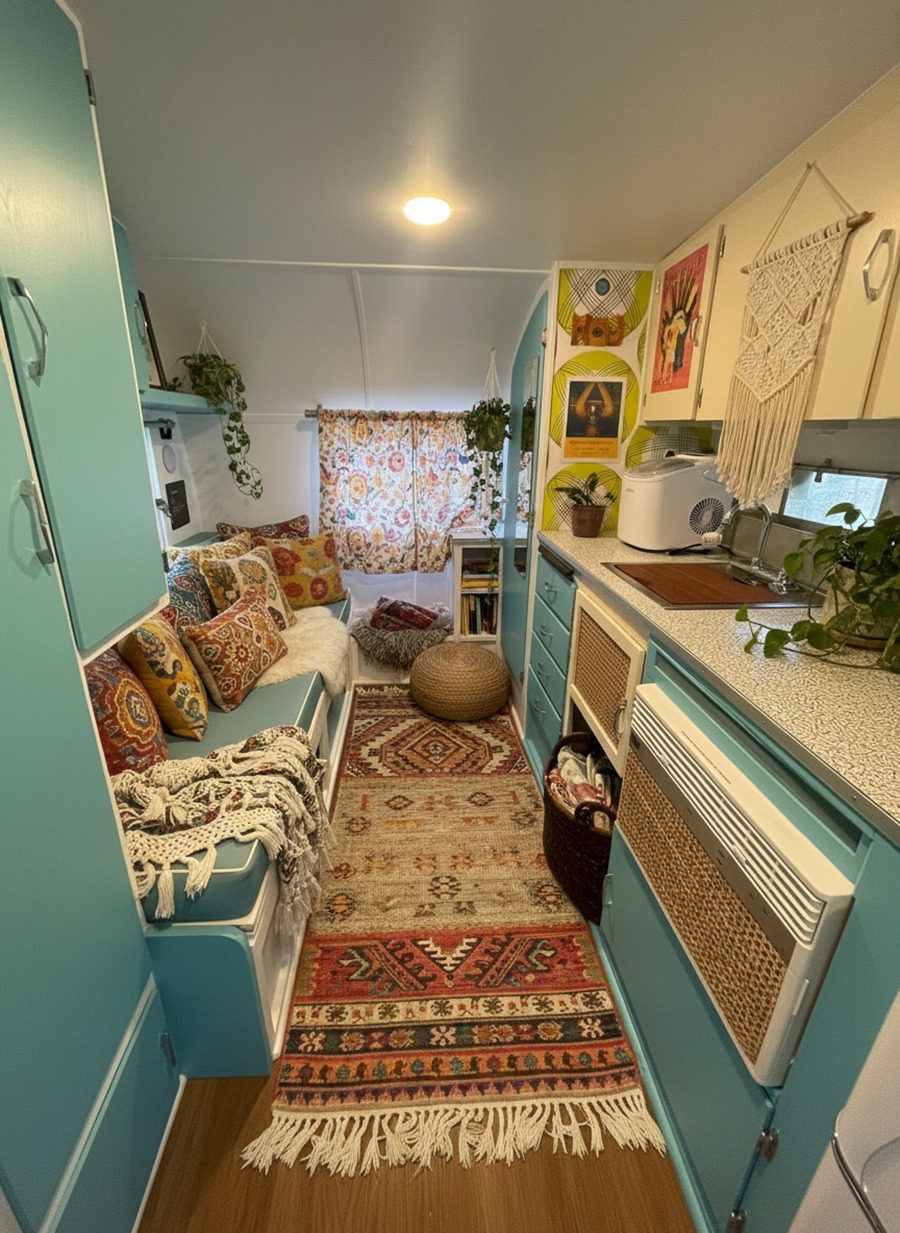 A rug makes a caravan feel like a room, not a box. And boho style loves rugs. Better yet, rugs add warmth and help with sound.