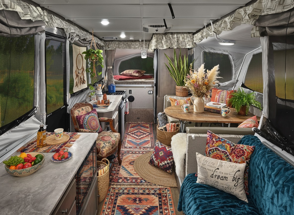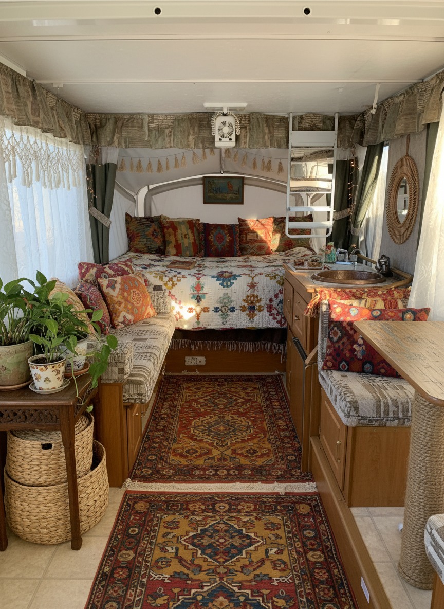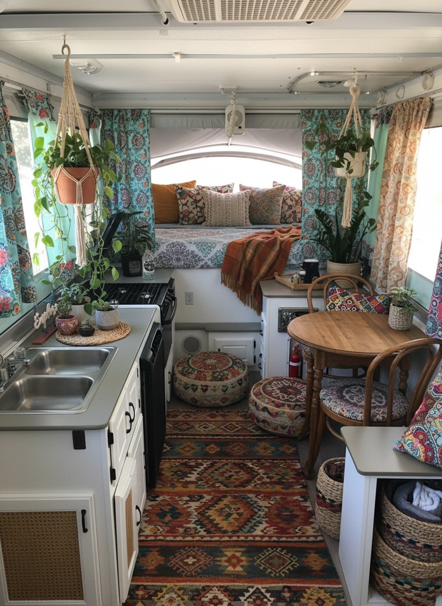 Even better, boho is caravan-friendly. Why? Because boho loves flexible pieces. It loves cozy corners. And it thrives on smart storage that still looks cute.