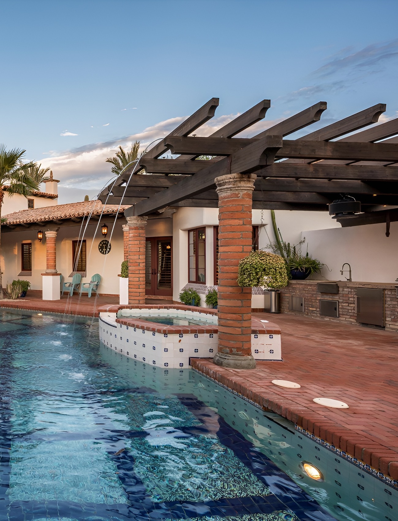 Arches are a signature part of hacienda design. They soften a space and make it feel graceful right away. Around a pool, arches can frame an outdoor lounge, define a covered patio, or shape a garden wall.