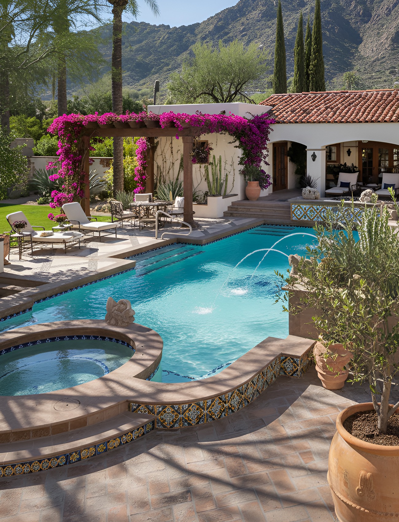 You can use colorful tile on the waterline, along stair risers, around a fountain, or on the face of a raised spa. Talavera-style patterns work especially well. They add that joyful, collected look that makes hacienda design feel alive.