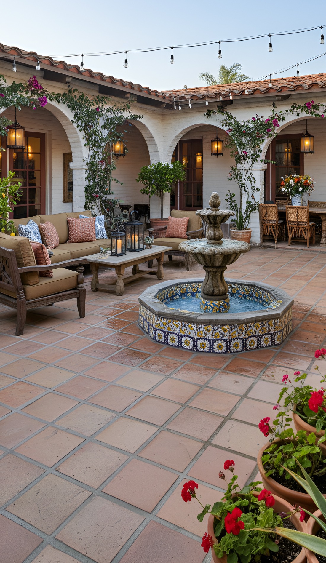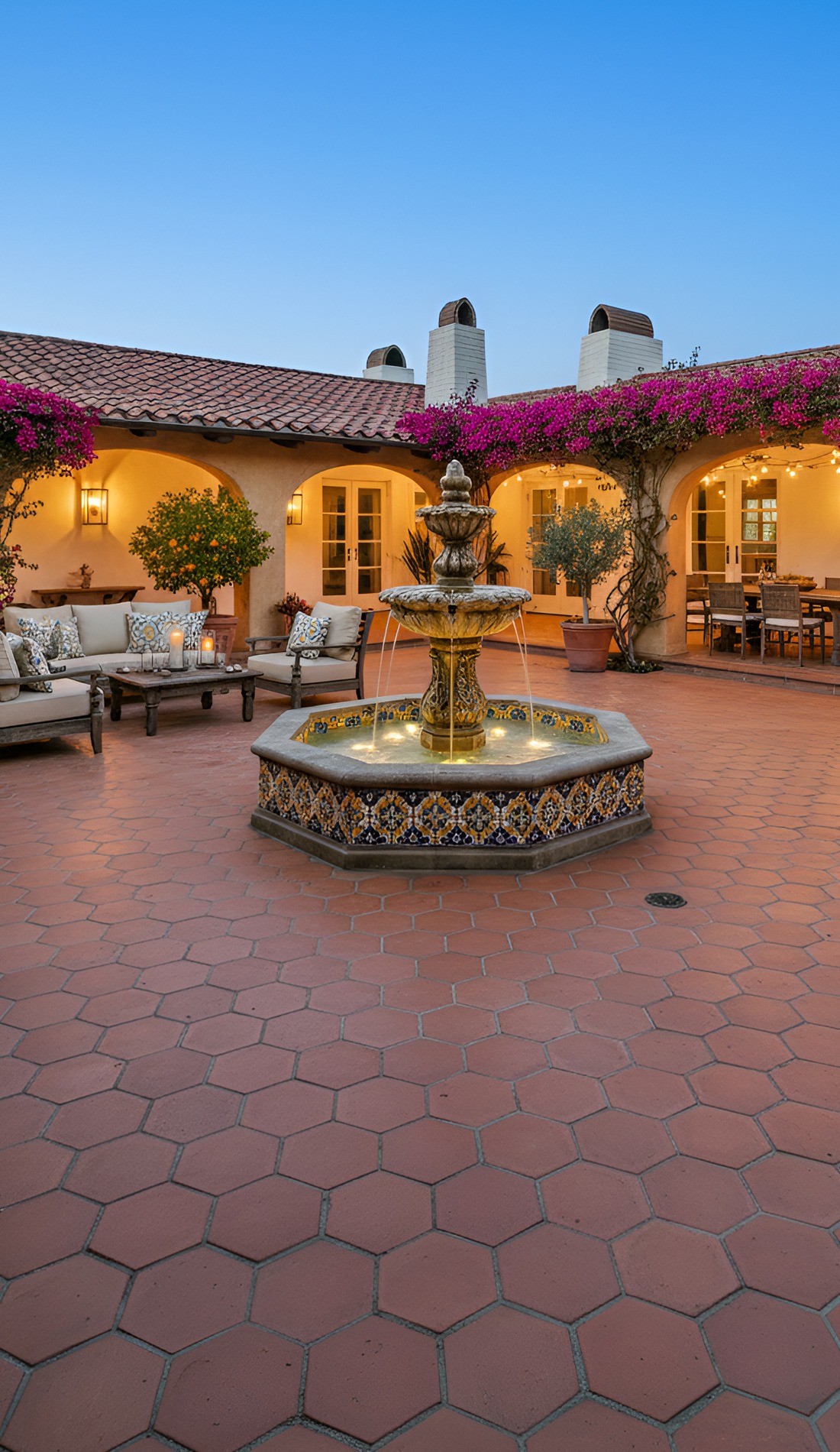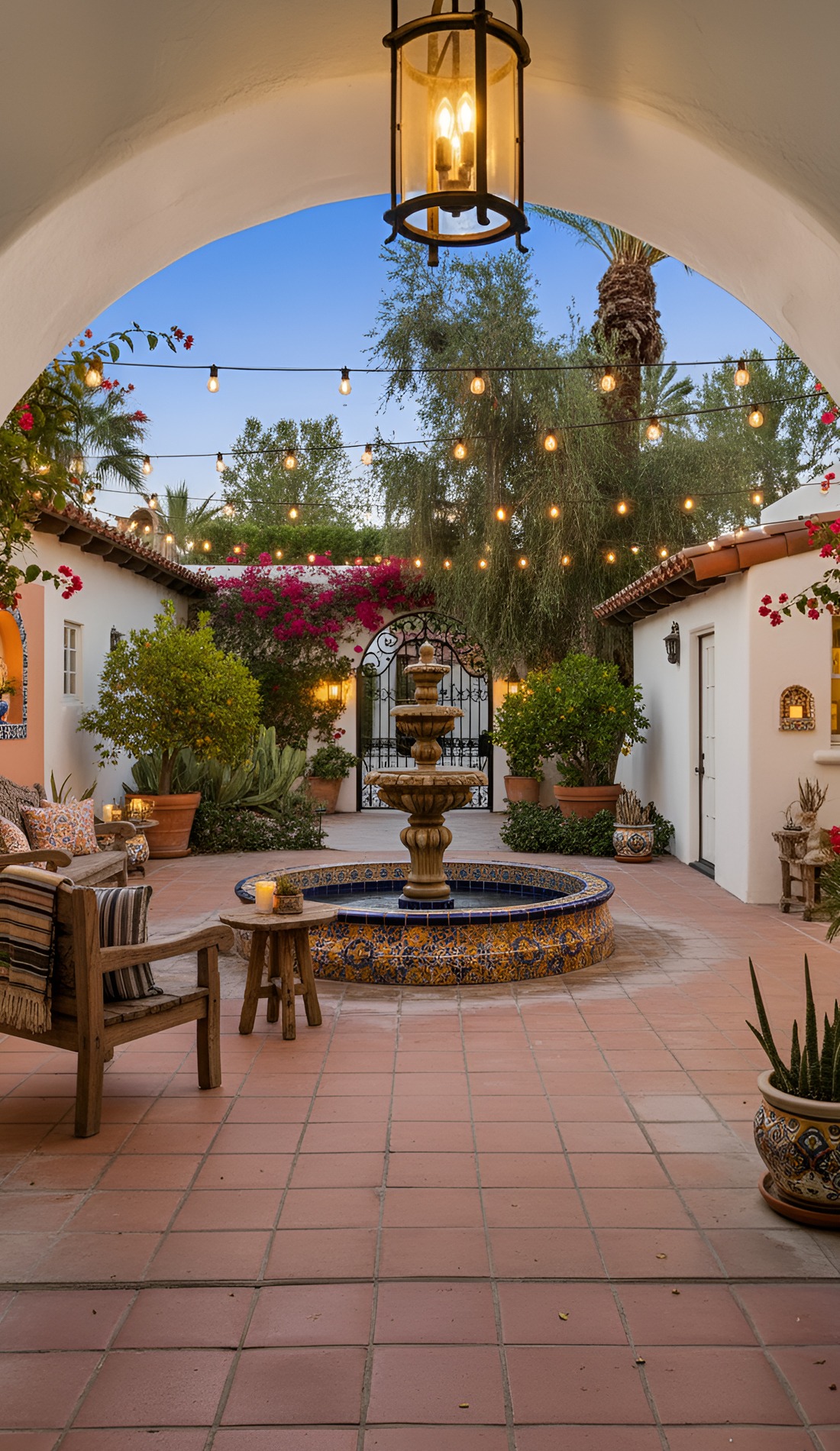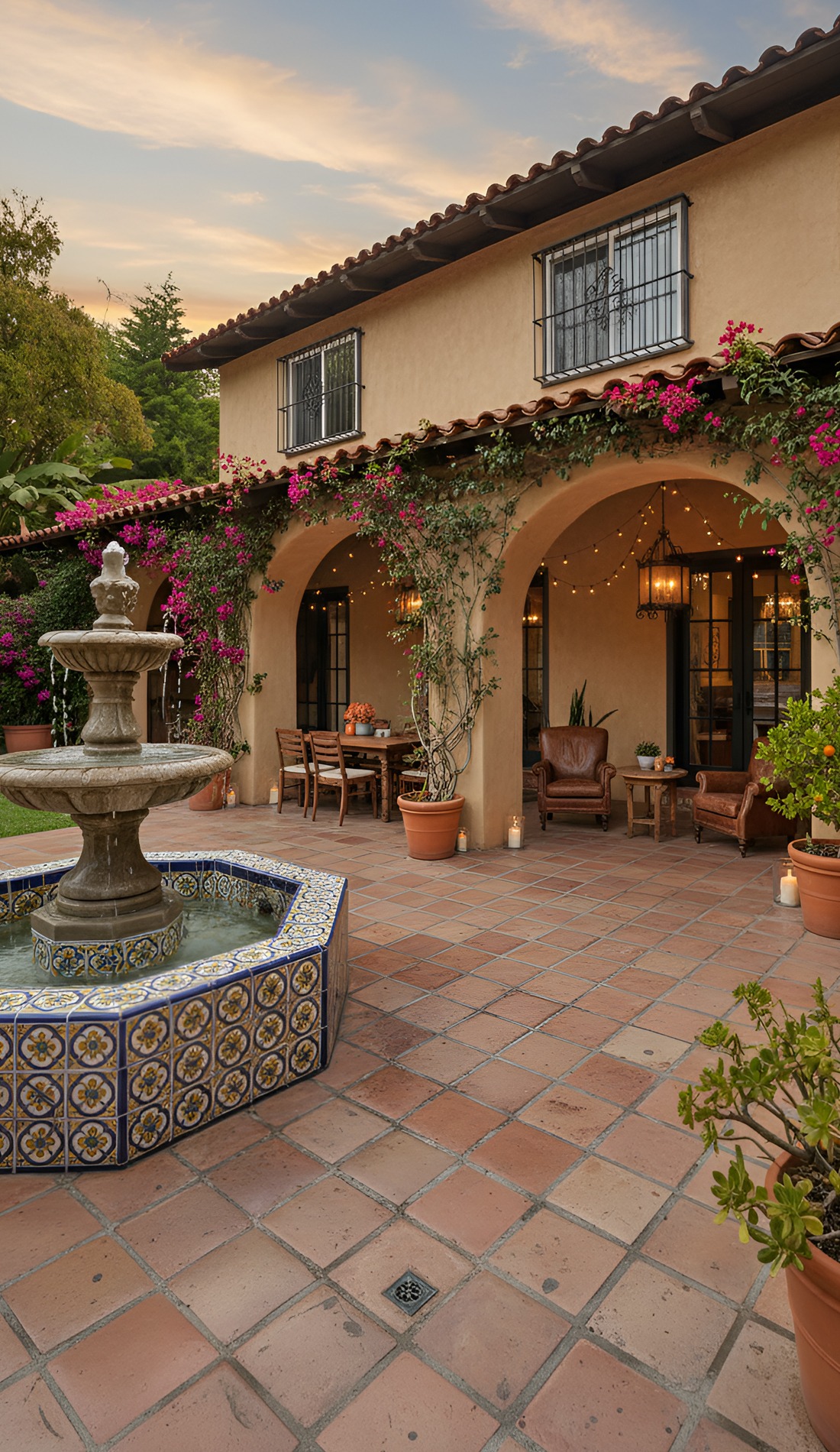 Dreaming of an outdoor space that feels warm, timeless, and full of charm? These Hacienda courtyard ideas bring together rustic textures, cozy seating, glowing lanterns, and classic old-world details. From bubbling fountains to terracotta floors, this look creates a courtyard that feels private, welcoming, and beautifully lived in.