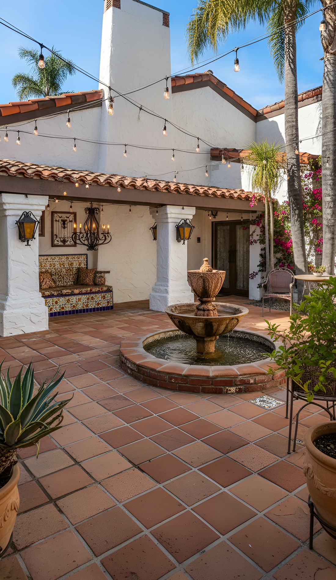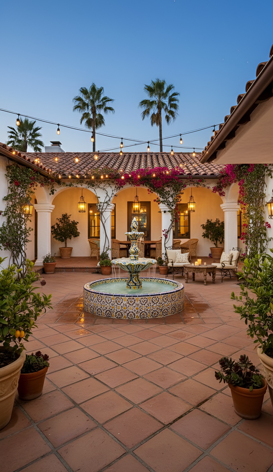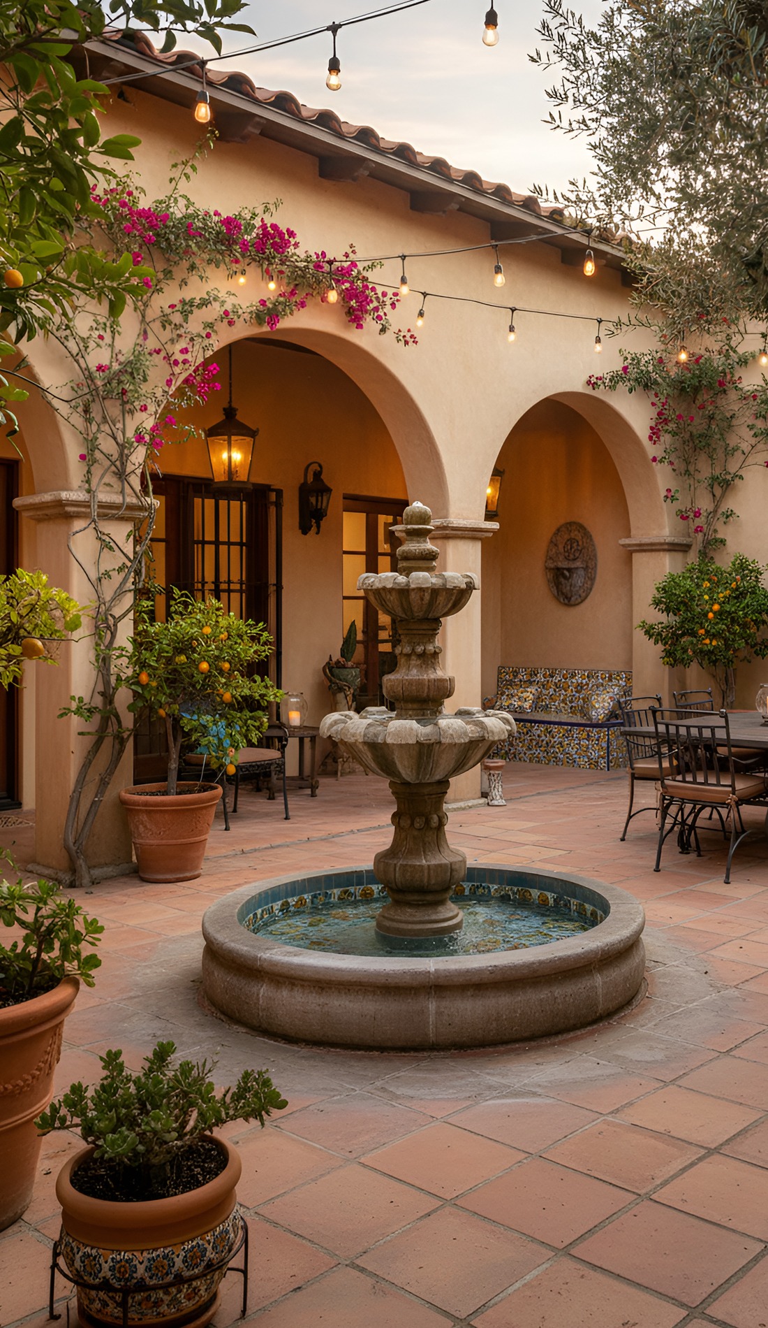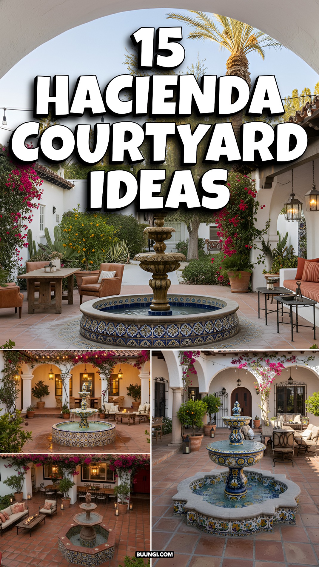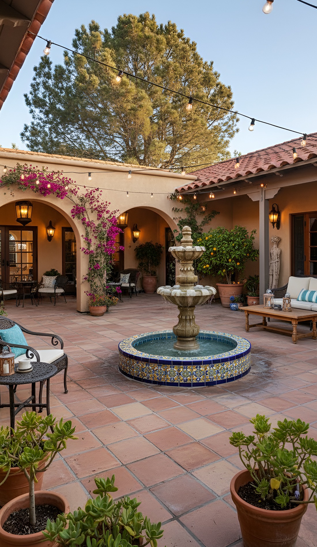 Dreaming of an outdoor space that feels warm, timeless, and full of charm? These Hacienda courtyard ideas bring together rustic textures, cozy seating, glowing lanterns, and classic old-world details. From bubbling fountains to terracotta floors, this look creates a courtyard that feels private, welcoming, and beautifully lived in.