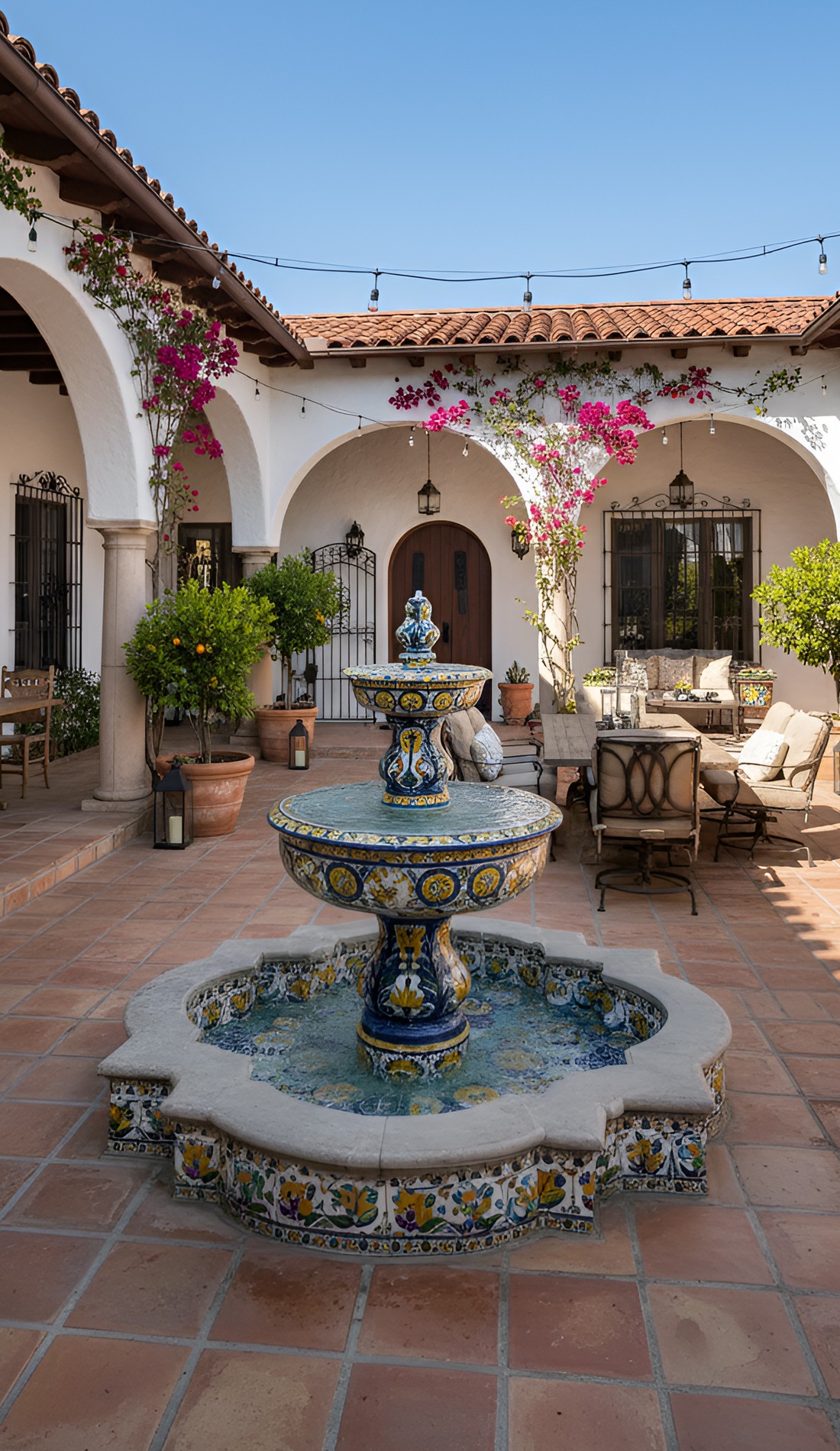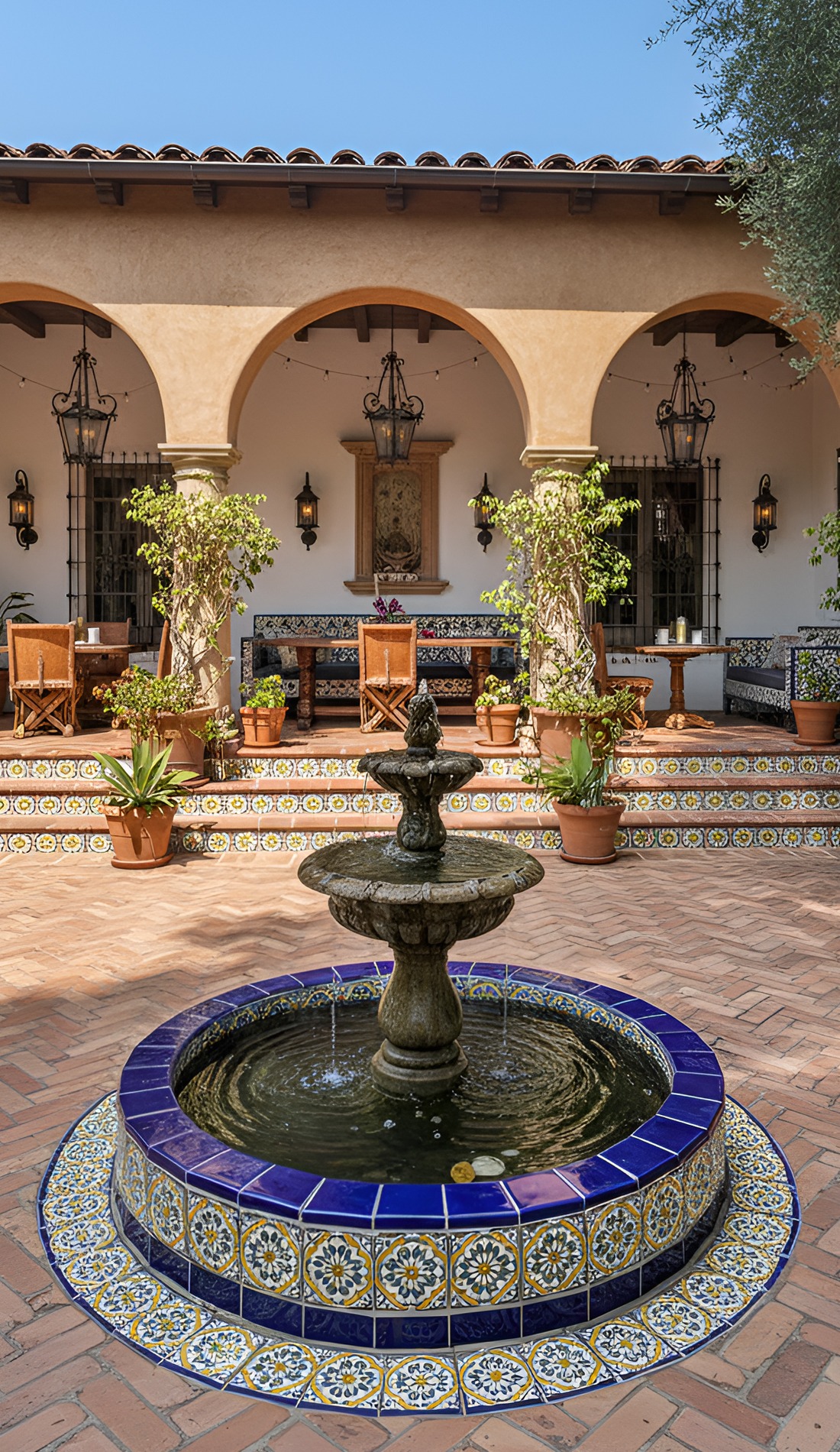 Nothing says Hacienda courtyard quite like a central fountain. It is often the heart of the whole design. It gives the space movement, sound, and a sense of calm. Even a simple fountain can make a courtyard feel historic and deeply rooted.