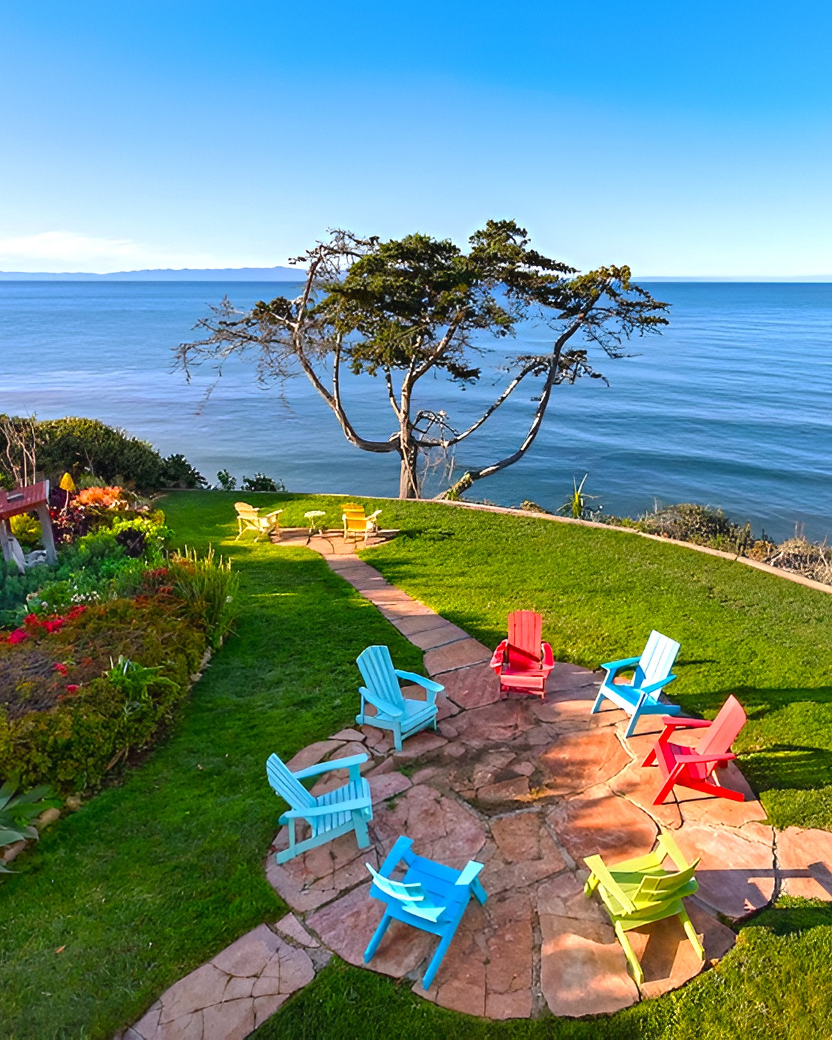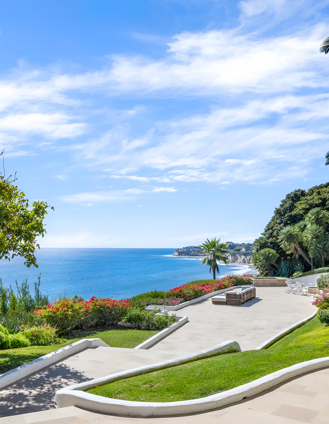 The smart move here is how the yard handles elevation. Instead of fighting the bluff, it uses curves to make the slope feel graceful. That makes the whole backyard look calmer. It also helps the ocean feel like part of the garden, not separate from it.
