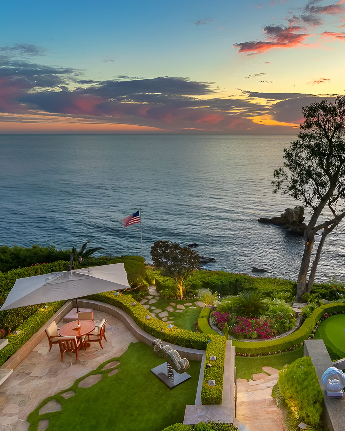 This backyard feels like a luxury retreat. The pool sits close to the bluff, which gives it major drama. Around it, clipped hedges and stone paths create order. Then the sunset sky does the rest. The whole yard feels intimate, even though the view is vast.