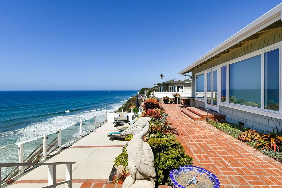 The house architecture helps too. The columns and doors give the patio a sense of rhythm. So, even though the ocean is the star, the space still feels wrapped and comfortable. This backyard works because it blends strong built elements with soft plant life. It feels elegant, but never cold.